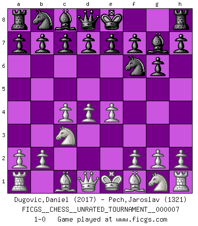 Last move : 1-0 2010 June 27 22:17:58 [Event "FICGS__CHESS__UNRATED_TOURNAMENT__000007"] [Site "FICGS"] [Date "2010.05.14"] [Round "1"] [White "Dugovic,Daniel"] [Black "Pech,Jaroslav"] [Result "1-0"] [WhiteElo "2017"] [BlackElo "1321"] 1.c4 Nf6 2.Nc3 g6 3.d4 Bg7 4.e4 1-0 English Opening Player White won this chess game. Follow this game move after move (download)In order to improve your game, you must study the endgame before everything else, for whereas the endings can be studied and mastered by themselves, the middle game and the opening must be studied in relation to the endgame. (Jose Raul Capablanca) Zeige mir drei Eröffnungsvarianten und ich beweise dir, dass zwei davon inkorrekt sind. (Emanuel Lasker) El Ajedrez es despiadado: debes de estar preparado para matar gente. (Nigel Short) Des combinaisons [dans le jeu d'échecs] pareilles à des mélodies. Je crois entendre pour ainsi dire la musique des coups... (Vladimir Nabokov) Nobody is always a winner, and anybody who says he is, is either a liar or doesn't play poker. (Amarillo Slim)