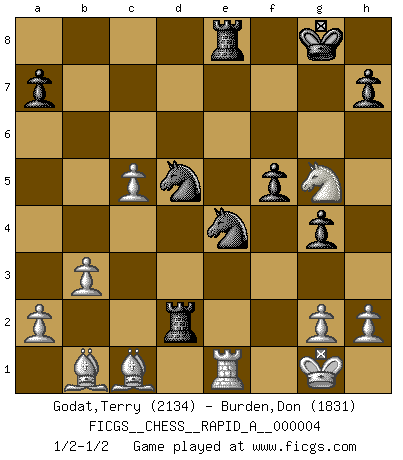 Last move : 1/2-1/2 2007 February 10 14:10:36 [Event "FICGS__CHESS__RAPID_A__000004"] [Site "FICGS"] [Date "2006.11.01"] [Round "1"] [White "Godat,Terry"] [Black "Burden,Don"] [Result "1/2-1/2"] [WhiteElo "2134"] [BlackElo "1831"] 1.e4 c5 2.Nc3 Nc6 3.Nf3 e5 4.Bc4 Be7 5.d3 Nf6 6.Nd2 d6 7.Nf1 Bg4 8.f3 Be6 9.Ne3 O-O 10.O-O Rb8 11.f4 exf4 12.Rxf4 Nd7 13.Ncd5 b5 14.Bb3 Bg5 15.Rf1 Nde5 16.c3 c4 17.dxc4 Bxe3+ 18.Nxe3 bxc4 19.Bc2 Qa5 20.Kh1 Rfe8 21.Qe2 Nd7 22.Rd1 Nc5 23.Rxd6 Qc7 24.Rxe6 Rxe6 25.Qxc4 Ne5 26.Nd5 Nxc4 27.Nxc7 Rf6 28.Kg1 Rb7 29.Nd5 Re6 30.b3 Nb6 31.Nf4 Re8 32.Ba3 Nxe4 33.Re1 f5 34.c4 Rd7 35.c5 g5 36.Nh3 Rd2 37.Bb1 g4 38.Ng5 Nd5 39.Bc1 1/2-1/2 Sicilian : Closed, 2...Nc6 Kingside Castling by player Black (move 9) Kingside Castling by player White (move 10) This chess game ended in a draw. Follow this game move after move (download)I have never in my life played the French Defence, which is the dullest of all openings. (Wilhelm Steinitz) Das typische an einem Großmeister ist, daß er eine gewonnene Position schnell und schmerzlos gewinnt. (Irving Chernev) Antes de los Finales, los dioses han colocado el Juego Medio. (Siegbert Tarrasch) On entre au jeu d'Echecs comme on entre en Religion. Pour le joueur d'Echecs, la partie d'Echecs c'est l'office, la messe, le défilé du 1er Mai, le dépôt de gerbe au Monument aux Morts. C'est un drame sacré. (Michel Roos) Computers are like Old Testament gods; lots of rules and no mercy. (Joseph Campbell)
