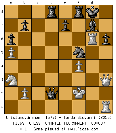 Last move : 0-1 2010 September 1 2:44:5 [Event "FICGS__CHESS__UNRATED_TOURNAMENT__000007"] [Site "FICGS"] [Date "2010.05.14"] [Round "1"] [White "Cridland,Graham"] [Black "Tanda,Giovanni"] [Result "0-1"] [WhiteElo "1577"] [BlackElo "2055"] 1.e4 c6 2.d4 d5 3.Nc3 g6 4.Bd3 Bg7 5.e5 Nh6 6.Qe2 Bg4 7.f3 Be6 8.g4 Nd7 9.Nh3 c5 10.Ng5 cxd4 11.Nxe6 fxe6 12.Nb5 Qb6 13.a4 a6 14.a5 Qc5 15.Na3 Nxe5 16.f4 Nexg4 17.Qxe6 Ne3 18.Bd2 Ng2+ 19.Kf2 Ne3 20.Rhg1 Nhf5 21.Rg5 Qc6 22.Bxf5 Nxf5 23.Qe2 O-O 24.h4 Nxh4 25.Rh1 d3 26.Qxd3 Nf5 27.c4 Rad8 28.Qh3 h6 29.cxd5 Qxd5 30.Rxg6 Qxd2+ 0-1 Caro-Kann : Gurgenidze system Kingside Castling by player Black (move 23) Player Black won this chess game. Follow this game move after move (download)When asked, -How is that you pick better moves than your opponents?, I responded: I'm very glad you asked me that, because, as it happens, there is a very simple answer. I think up my own moves, and I make my opponent think up his. (Alexander Alekhine) Wenn Dein Gegner dir ein Remis anbietet, versuch herauszufinden, weshalb er glaubt schlechter zu stehen. (Nigel Short) Prefiero perder una partida realmente buena, que ganar una mala. (David Levy) Vous n'êtes pas toujours obligé de jouer le meilleur coup. Un coup doit être actif, entreprenant, correct et beau ! (David Bronstein) Dave, my mind is going. I can feel it. (HAL 9000 in 2001, a space odyssey)