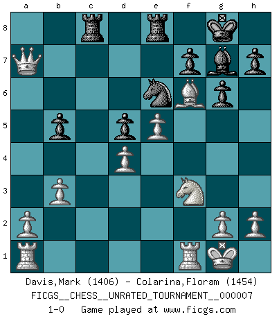 Last move : 1-0 2010 August 12 3:10:13 [Event "FICGS__CHESS__UNRATED_TOURNAMENT__000007"] [Site "FICGS"] [Date "2010.05.14"] [Round "1"] [White "Davis,Mark"] [Black "Colarina,Floram"] [Result "1-0"] [WhiteElo "1406"] [BlackElo "1454"] 1.e4 e6 2.Nf3 d5 3.exd5 exd5 4.b3 Nf6 5.Bb2 Be7 6.d3 Bg4 7.Be2 O-O 8.Ne5 Bxe2 9.Qxe2 Bd6 10.O-O Re8 11.f4 Nfd7 12.Qh5 g6 13.Qh6 Bf8 14.Qh3 Nxe5 15.fxe5 Bg7 16.d4 Nd7 17.Nd2 c5 18.c3 b6 19.Nf3 Rc8 20.Bc1 Nf8 21.Bg5 Qd7 22.Qxd7 Ne6 23.Qxa7 cxd4 24.cxd4 b5 25.Bf6 1-0 French defense Kingside Castling by player Black (move 7) Kingside Castling by player White (move 10) Player White won this chess game. Follow this game move after move (download)For me, Chess is life and every game is like a new life. Every Chess player gets to live many lives in one lifetime. (Eduard Gufeld) Wir können eben der zündenden Macht des Opfers nicht wiederstehen, denn die Begeisterung für das Opfer liegt in der Natur des Menschen. (Rudolf Spielmann) Cualquier cambio de material en una posición debe venir por medio de un mate, una captura o promoción de Peón. (Purdy) Demandez au pauvre Cg1 ce qu'il en pense. Eduard Gufeld à propos de la variante Saemisch de l'Est-Indienne. Life is verb, not a noun. (Charlotte Perkins Gilman)