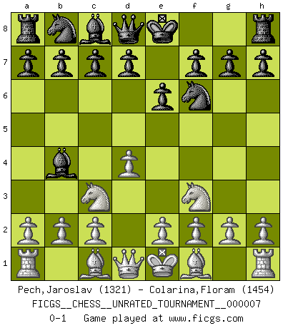 Last move : 0-1 2010 June 27 22:18:10 [Event "FICGS__CHESS__UNRATED_TOURNAMENT__000007"] [Site "FICGS"] [Date "2010.05.14"] [Round "1"] [White "Pech,Jaroslav"] [Black "Colarina,Floram"] [Result "0-1"] [WhiteElo "1321"] [BlackElo "1454"] 1.Nf3 Nf6 2.Nc3 e6 3.d4 Bb4 0-1 Reti Opening Player Black won this chess game. Follow this game move after move (download)Bobby Fischer is the greatest Chess player who has ever lived. (Ken Smith) Unter Putin wird alles Geld aus Russland wie von einem Staubsauger nach Moskau umgeleitet, das ist wie ein schwarzes Loch. (Garry Kasparov) El Ajedrez expande y enriquece tu mente. (Saudin Robovic) Celui qui prend des risques peut perdre, celui qui n'en prend pas perd toujours. (Xavier Tartacover) There are two kinds of people in the world, my friend. Those who have a loaded gun and those who dig. You dig ! (Blondie in The Good, The Bad and The Ugly)