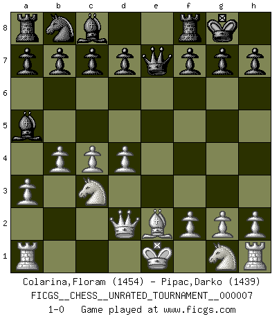 Last move : 1-0 2010 July 6 9:21:13 [Event "FICGS__CHESS__UNRATED_TOURNAMENT__000007"] [Site "FICGS"] [Date "2010.05.14"] [Round "1"] [White "Colarina,Floram"] [Black "Pipac,Darko"] [Result "1-0"] [WhiteElo "1454"] [BlackElo "1439"] 1.c4 e5 2.Nc3 Nf6 3.e3 Bb4 4.d4 exd4 5.exd4 Ne4 6.Bd2 Nxd2 7.Qxd2 O-O 8.a3 Qe7+ 9.Be2 Ba5 10.b4 1-0 This chess game has been lost on time (started : 2010.05.14 12:38:40) English Opening Kingside Castling by player Black (move 7) Player White won this chess game. Follow this game move after move (download)Different people feel differently about resigning. (Bobby Fischer) Um sich vor der Gefahr einer Erkältung zu schützen, sorge der wanderlustige König beizeiten für ein brauchbares Versteck. (Aaron Nimzowitsch) Peones: ellos son el alma de esta partida, solos forman el ataque y la defensa. (Philidor) Le système Elo représente seulement une moyenne. Il est simplement un indicateur de votre stabilité. (Anatoli Karpov) Life is the sum of all your choices. (Albert Camus)