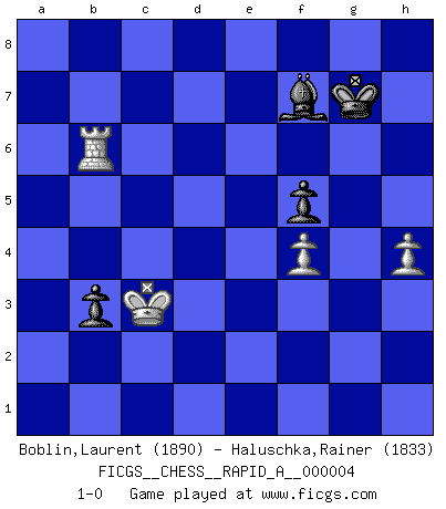 Last move : 1-0 2007 February 23 3:22:40 [Event "FICGS__CHESS__RAPID_A__000004"] [Site "FICGS"] [Date "2006.11.01"] [Round "1"] [White "Boblin,Laurent"] [Black "Haluschka,Rainer"] [Result "1-0"] [WhiteElo "1890"] [BlackElo "1833"] 1.e4 c5 2.c3 Nc6 3.Nf3 Nf6 4.e5 Nd5 5.d4 cxd4 6.Bc4 Nb6 7.Bb3 g6 8.Ng5 Bg7 9.Bxf7+ Kf8 10.cxd4 d6 11.Bb3 dxe5 12.Qf3+ Bf6 13.Nf7 Qc7 14.Nxh8 Nxd4 15.Qc3 Qxc3+ 16.bxc3 Nxb3 17.axb3 a5 18.Nxg6+ hxg6 19.c4 a4 20.Be3 axb3 21.Rxa8 Nxa8 22.Kd2 e4 23.Nc3 Be6 24.Nxe4 Bxc4 25.Nxf6 exf6 26.Rc1 Be6 27.Rc5 Nb6 28.Bd4 f5 29.Rb5 Nd7 30.Rxb7 g5 31.f4 g4 32.h4 gxh3 33.gxh3 Ke7 34.h4 Bf7 35.Rb5 Nf6 36.Bxf6+ Kxf6 37.Rb6+ Kg7 38.Kc3 1-0 Sicilian : Alapin's variation (2.c3) 10 pieces endgame at move 33 : White KRBPP , Black KBNPP WHITE : King + 1 Rook 1 Bishop 2 Pawns BLACK : King + 1 Bishop 1 Knight 2 Pawns 9 pieces endgame at move 36 : White KRBPP , Black KBPP WHITE : King + 1 Rook 1 Bishop 2 Pawns BLACK : King + 1 Bishop 2 Pawns 8 pieces endgame at move 36 : White KRPP , Black KBPP WHITE : King + 1 Rook 2 Pawns BLACK : King + 1 Bishop 2 Pawns Player White won this chess game. Follow this game move after move (download)Daring ideas are like Chess men moved forward. They may be beaten, but they may start a winning game. (Johann Wolfgang von Goethe) Die Fehler sind da, Sie warten nur darauf gemacht zu werden. (Savielly Grigorievitsch Tartakower) En el Ajedrez, cuando menos, el valiente hereda la tierra. (Edmar Mednis) Ce n'est pas pour s'amuser qu'il joue aux échecs : il célèbre un culte. (Vladimir Nabokov) Every now and then a man's mind is stretched by a new idea and never shrinks back to its former dimensions. (Oliver Wendell Holmes, Sr.)