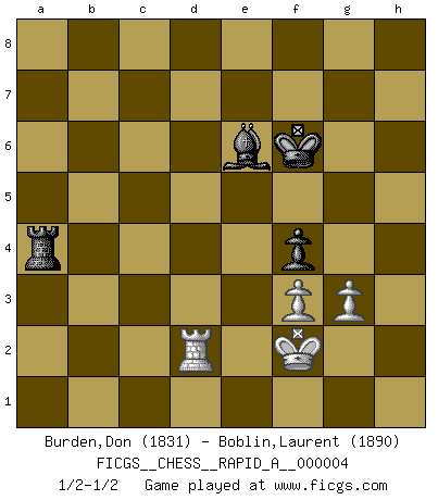Last move : 1/2-1/2 2007 April 14 9:18:4 [Event "FICGS__CHESS__RAPID_A__000004"] [Site "FICGS"] [Date "2006.11.01"] [Round "1"] [White "Burden,Don"] [Black "Boblin,Laurent"] [Result "1/2-1/2"] [WhiteElo "1831"] [BlackElo "1890"] 1.e4 c6 2.d4 d5 3.exd5 cxd5 4.c4 Nf6 5.Nc3 Nc6 6.Bg5 e6 7.cxd5 exd5 8.Bb5 Be7 9.Nf3 O-O 10.Bxc6 bxc6 11.Ne5 h6 12.Be3 Bd6 13.O-O Qc7 14.Re1 Re8 15.Bf4 Bf5 16.Rc1 Qb7 17.Na4 Rac8 18.Re2 g5 19.Bd2 Ne4 20.Nc3 Nxd2 21.Qxd2 c5 22.Rd1 Bxe5 23.Rxe5 Rxe5 24.dxe5 d4 25.Ne2 Bg6 26.h4 Qe4 27.hxg5 hxg5 28.Rc1 Kh7 29.Nxd4 Rd8 30.Nf3 Rxd2 31.Nxg5+ Kh6 32.Nxe4 Bxe4 33.Rxc5 Rxb2 34.Ra5 Kg6 35.Rxa7 Bd5 36.a4 Kf5 37.f3 Kxe5 38.Kh2 Ra2 39.Kg3 Kd4 40.a5 Ke5 41.Kh3 Kf4 42.Kh2 Ra1 43.Ra6 Ra4 44.Ra7 Ra2 45.Ra6 f5 46.Kg1 Bf7 47.Kh2 Bc4 48.Ra7 Bf1 49.Rg7 Rxa5 50.Kg1 Bd3 51.Rc7 Ra2 52.Rh7 Bb5 53.Rc7 Rd2 54.Rg7 Bc4 55.Rc7 Bd5 56.Rg7 Ke5 57.Rh7 Bc4 58.Rh8 Bb3 59.Re8+ Be6 60.Rh8 f4 61.Ra8 Rb2 62.Ra7 Kf6 63.Ra5 Rd2 64.Ra4 Kg5 65.Ra5+ Bf5 66.Kh2 Rf2 67.Kg1 Re2 68.Kh2 Rb2 69.Kg1 Rb4 70.Kf2 Kf6 71.Ra2 Be6 72.Rd2 Ra4 73.g3 1/2-1/2 Caro-Kann : Panov-Botvinnik, normal variation Kingside Castling by player Black (move 9) Kingside Castling by player White (move 13) 10 pieces endgame at move 35 : White KRPPPP , Black KRBP WHITE : King + 1 Rook 4 Pawns BLACK : King + 1 Rook 1 Bishop 1 Pawn 9 pieces endgame at move 37 : White KRPPP , Black KRBP WHITE : King + 1 Rook 3 Pawns BLACK : King + 1 Rook 1 Bishop 1 Pawn 8 pieces endgame at move 49 : White KRPP , Black KRBP WHITE : King + 1 Rook 2 Pawns BLACK : King + 1 Rook 1 Bishop 1 Pawn This chess game ended in a draw. Follow this game move after move (download)In Chess, as it is played by masters, chance is practically eliminated. (Emanuel Lasker) Aljechin war kein Nazi. Er war ein Opportunist. Ein schrecklicher Mann. Er liebte Geld über alles und würde für Geld ein Jude, ein Katolik oder ein Protestant werden. (Miguel Najdorf) Una clavada es mas poderosa que una espada. (Fred Reinfeld) Le succès, c'est être capable d'aller d'échec en échec sans perdre son enthousiasme. (Winston Churchill) Good decisions come from experience, and experience comes from bad decisions. (Anonymous)