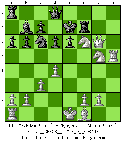 Last move : 1-0 2010 June 9 17:43:40 [Event "FICGS__CHESS__CLASS_D__000148"] [Site "FICGS"] [Date "2010.05.14"] [Round "1"] [White "Clontz,Adam"] [Black "Nguyen,Hao Nhien"] [Result "1-0"] [WhiteElo "1567"] [BlackElo "1575"] 1.e4 e6 2.Qh5 Nf6 3.Qh4 Be7 4.e5 Nd5 5.Qg3 g6 6.h4 Nc6 7.c3 b6 8.d4 d6 9.Bh6 f6 10.Nf3 a6 11.Nbd2 Bb7 12.h5 gxh5 13.Qg7 Rf8 14.Qxh7 Rf7 15.Qg6 Qd7 16.Ne4 Bf8 17.Bxf8 Kxf8 18.Rxh5 Ke7 19.exf6+ Nxf6 20.Nxf6 Qd8 21.Ng5 1-0 French defense Player White won this chess game. Follow this game move after move (download)You can only get good at Chess if you love the game. (Bobby Fischer) Wenn du gegen Bobby spielst, ist es keine Frage von gewinnen oder verlieren. Es ist eine Frage des Überlebens. (Boris Vassilievich Spassky) En manos de Fischer's, una diminuta ventaja teórica es tan buena como tener una Reina de ventaja. (Isaac Kashdan) Le succès, c'est être capable d'aller d'échec en échec sans perdre son enthousiasme. (Winston Churchill) The difference between perseverance and obstinacy is that one comes from a strong will, and the other from a strong won't. (Henry Ward Beecher)