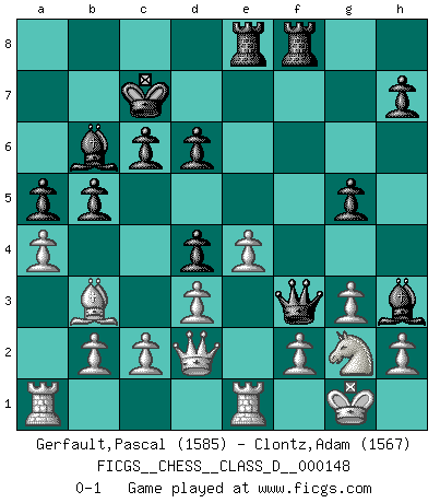 Last move : 0-1 2010 July 27 20:32:14 [Event "FICGS__CHESS__CLASS_D__000148"] [Site "FICGS"] [Date "2010.05.14"] [Round "1"] [White "Gerfault,Pascal"] [Black "Clontz,Adam"] [Result "0-1"] [WhiteElo "1585"] [BlackElo "1567"] 1.e4 e5 2.Nf3 Nc6 3.Bc4 Nd4 4.Nxd4 exd4 5.d3 Qh4 6.O-O Bd6 7.g3 Qh3 8.Qf3 Nh6 9.Bxh6 Qxh6 10.Qxf7+ Kd8 11.Qf3 Rf8 12.Qe2 c6 13.Nd2 b5 14.Bb3 a5 15.a3 g5 16.Nf3 Bc5 17.Ne5 Kc7 18.Nf3 d6 19.Ne1 Bh3 20.Ng2 Rae8 21.Qd2 Bb6 22.Rfe1 Qh5 23.a4 Qf3 0-1 King's pawn game Kingside Castling by player White (move 6) Player Black won this chess game. Follow this game move after move (download)I had a toothache during the first game. In the second game I had a headache. In the third game it was an attack of rheumatism. In the fourth game, I wasn't feeling well. And in the fifth game? Well, must one have to win every game ? (Siegbert Tarrasch) Über Kasparov: Es ist offensichtlich, daß er in einem totalitären Staat aufwuchs und deshalb zu diktatorischen Zügen neigt. (Viktor Kortschnoi) La pasion por jugar al Ajedrez es una de las mas inexplicables en el mundo. (H.G. Wells) Horreur, mais aussi harmonie suprême : qu'y avait-il en effet au monde en dehors des échecs ? Le brouillard, l'inconnu, le non-être... (Vladimir Nabokov) I've lost money so fast in these clubs it's left me reeling. I've read every poker book ever written, but the only way to get better at the game is to go out and play with people who are really good. The problem is, you stand to lose a lot of money doing it. (Matt Damon)