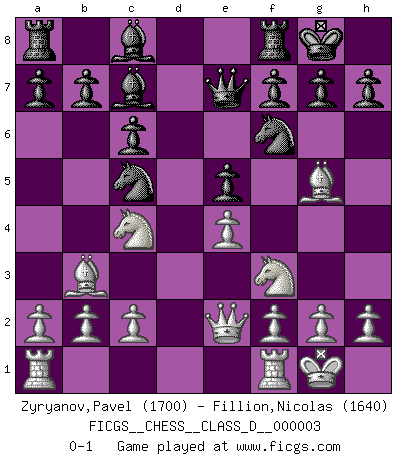 Last move : 0-1 2006 October 10 11:49:43 [Event "FICGS__CHESS__CLASS_D__000003"] [Site "FICGS"] [Date "2006.04.26"] [Round "1"] [White "Zyryanov,Pavel"] [Black "Fillion,Nicolas"] [Result "0-1"] [WhiteElo "1700"] [BlackElo "1640"] 1.e4 e5 2.Bc4 Nf6 3.d3 c6 4.Nf3 d5 5.Bb3 Bd6 6.O-O dxe4 7.dxe4 Na6 8.Nbd2 Bc7 9.Qe2 Nc5 10.Nc4 Qe7 11.Bg5 O-O 0-1 This chess game has been lost on time (started : 2006.04.26 12:13:16) Bishop's Opening : Berlin defense Kingside Castling by player White (move 6) Kingside Castling by player Black (move 11) Player Black won this chess game. Follow this game move after move (download)I'm not a materialistic person, in that, I don't suffer the lack or loss of money. The absence of worldly goods I don't look back on. For Chess is a way I can be as materialistic as I want without having to sell my soul. (Jamie Walter Adams) Alle offensichtlichen Züge sehen nach dem Spiel in der Analyse verdächtig aus. (Viktor Kortschnoi) En posiciones complicadas, Bobby Fischer pocas veces tuvo que temer de cualquiera. (Paul Keres) Les échecs c'est le défi de l'alpiniste, toujours plus haut, prêt à tout pour monter à l'assaut du Roi ennemi. Les échecs, c'est de la musique en mouvement, un ballet majestueux pour les yeux. C'est de la poésie composée par les fantômes du passé qui au même titre que Rimbaud ou Verlaine méritent notre admiration. Les échecs, c'est de la peinture ou le moindre mouvement modifie le tableau pour en faire un Picasso ou un Van Gogh. Les échecs, c'est tout et rien, c'est la vie et la mort. Jjulie33 sur le forum de France-Echecs. But they are useless. They can only give you answers. (Pablo Picasso, about computers)