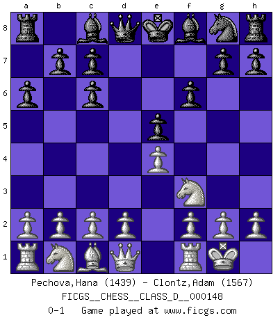 Last move : 0-1 2010 June 28 14:56:55 [Event "FICGS__CHESS__CLASS_D__000148"] [Site "FICGS"] [Date "2010.05.14"] [Round "1"] [White "Pechova,Hana"] [Black "Clontz,Adam"] [Result "0-1"] [WhiteElo "1439"] [BlackElo "1567"] 1.e4 e5 2.Nf3 Nc6 3.Bb5 a6 4.Bxc6 dxc6 5.O-O f6 0-1 Ruy Lopez : Exchange, Gligoric variation Kingside Castling by player White (move 5) Player Black won this chess game. Follow this game move after move (download)In life, as in Chess, one's own Pawns block one's way. A man's very wealth, ease, leisure, children, books, which should help him to win, more often checkmate him. (Charles Buxton) Wenn Du nicht kämpfst, um anderen etwas zu beweisen, sondern nur für Dich selbst, dann bist du fast unbesiegbar. (Garry Kasparov) Cuando tengas duda... ¡juega al Ajedrez!. (Tevis) La vie est comme un jeu d'échecs : nous esquissons un plan, mais celui-ci est tributaire de ce que daignent faire l'adversaire aux échecs et le destin dans la vie. (Arthur Schopenhauer) We need strong personalities and only one world champion to attract sponsors. (Anatoly Karpov)