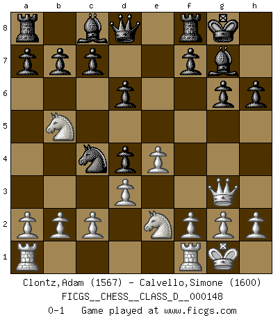 Last move : 0-1 2010 July 7 22:39:33 [Event "FICGS__CHESS__CLASS_D__000148"] [Site "FICGS"] [Date "2010.05.14"] [Round "1"] [White "Clontz,Adam"] [Black "Calvello,Simone"] [Result "0-1"] [WhiteElo "1567"] [BlackElo "1600"] 1.e4 e5 2.Qh5 Nc6 3.Bc4 g6 4.Qf3 Nf6 5.Ne2 Bg7 6.Nbc3 O-O 7.d3 d6 8.Bg5 h6 9.Be3 Ng4 10.O-O Nd4 11.Bxd4 exd4 12.Nb5 Ne5 13.Qg3 Nxc4 0-1 Variation Patzer Opening : Patzer Opening Kingside Castling by player Black (move 6) Kingside Castling by player White (move 10) Player Black won this chess game. Follow this game move after move (download)What is the difference between chess and football? Everybody understands football, but nobody plays it. Everybody plays chess, but nobody understands it. Everything is relative. (Vladimir Kramnik) Weshalb minderdergeübte Spieler mit g2-g4 beginnen? Die betreffenden sind unschlüssig, ob sie nun rechts (h4) oder links (f4) beginnen sollen, und in ihrer Ratlosigkeit entschliessen sie sich nach guter Bürgerart dazu, den goldenen Mittelweg zu wählen. (Aaron Nimzowitsch) El Ajedrez es sobre todo, ¡una pelea!. (Emanuel Lasker) Roi des jeux et jeu des rois, les échecs portent en eux un sentiment d'infini. Ils donnent à celui qui s'est efforcé d'en approfondir les arcanes l'impression de n'être pas à la mesure de l'homme; en fait, ils constituent un résumé de l'univers, un microcosme, et figurent cette grande échelle qui, dans les plans de la lumière descend jusqu'à la matière, qui des abîmes insondables remonte jusqu'en l'infini de Dieu. (Pyrame) It is a good thing for an uneducated man to read books of quotations. (Winston Churchill)