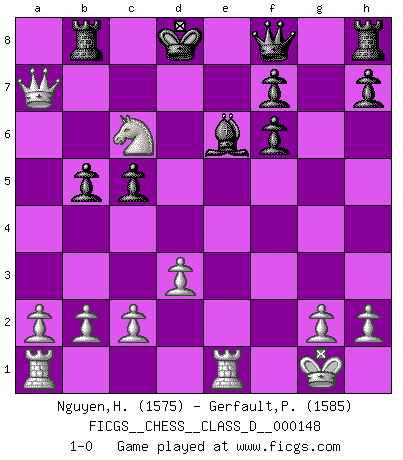 Last move : 1-0 2010 June 23 18:44:30 [Event "FICGS__CHESS__CLASS_D__000148"] [Site "FICGS"] [Date "2010.05.14"] [Round "1"] [White "Nguyen,Hao Nhien"] [Black "Gerfault,Pascal"] [Result "1-0"] [WhiteElo "1575"] [BlackElo "1585"] 1.e4 c5 2.f4 d5 3.exd5 Qxd5 4.Nc3 Qd8 5.Nf3 Nf6 6.Bb5+ Bd7 7.O-O e6 8.f5 exf5 9.Re1+ Be7 10.Qe2 Nc6 11.d3 a6 12.Bxc6 Bxc6 13.Bg5 b5 14.Nh4 Bd7 15.Bxf6 gxf6 16.Nd5 Be6 17.Nxe7 Qxe7 18.Nxf5 Qf8 19.Qf3 Rc8 20.Qb7 Kd8 21.Qxa6 Rb8 22.Qa7 Kc8 23.Ne7+ Kd8 24.Nc6+ 1-0 Sicilian : Grand Prix attack Kingside Castling by player White (move 7) Player White won this chess game. Follow this game move after move (download)A strong memory, concentration, imagination, and a strong will is required to become a great Chess player. (Bobby Fischer) Ja, jede Frau in Holland liebt mich bestimmt, und alle Männer hassen mich. (Loek van Wely) El Ajedrez es realmente noventa y nueve por ciento calculación. (Soltis) La conception d'un plan est le processus par lequel un joueur exploite les avantages de sa position tout en s'efforçant d'en réduire au minimum les inconvénients. Afin de garantir le succès, un plan doit toujours se fonder sur un diagnostic objectif des particularités d'une position. La conception d'un plan est d'autant plus difficile que la position est équilibrée, et grandement facilitée lorsqu'il n'existe qu'un seul plan susceptible de répondre aux exigences de la position. (Harry Golombek) I don't diet. I just don't eat as much as I'd like to. (Linda Evangelista, supermodel)
