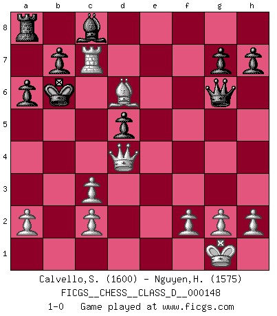 Last move : 1-0 2010 June 1 15:22:1 [Event "FICGS__CHESS__CLASS_D__000148"] [Site "FICGS"] [Date "2010.05.14"] [Round "1"] [White "Calvello,Simone"] [Black "Nguyen,Hao Nhien"] [Result "1-0"] [WhiteElo "1600"] [BlackElo "1575"] 1.e4 e5 2.Nf3 Nc6 3.d4 exd4 4.Nxd4 Qh4 5.Nc3 Bb4 6.Be2 Qxe4 7.Ndb5 Bxc3+ 8.bxc3 Kd8 9.O-O Nge7 10.Re1 a6 11.Nd4 Qg6 12.Bh5 Qf6 13.Bxf7 Nxd4 14.Qxd4 Qxf7 15.Bg5 Re8 16.Rxe7 Rxe7 17.Re1 Qg6 18.Bxe7+ Ke8 19.Qf4 d5 20.Bd6 Kd7 21.Re7+ Kc6 22.Rxc7+ Kb6 23.Qd4+ 1-0 Scotch : Steinitz variation Kingside Castling by player White (move 9) Player White won this chess game. Follow this game move after move (download)Best by test: 1. e4 (Bobby Fischer) Fischer machte Schach einfach zu einer aufregenden Sache, wann immer er sich ans Brett setzte. (Raymond Keene) Uno no tiene que jugar muy bien, es suficiente jugar mejor que el oponente. (Siegbert Tarrasch) RxDa4 pat (...) In theory there is no difference between theory and practice. In practice there is. (Yogi Berra)