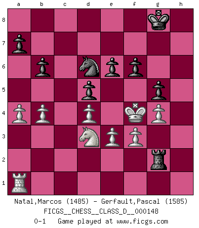 Last move : 0-1 2010 July 5 19:6:33 [Event "FICGS__CHESS__CLASS_D__000148"] [Site "FICGS"] [Date "2010.05.14"] [Round "1"] [White "Natal,Marcos"] [Black "Gerfault,Pascal"] [Result "0-1"] [WhiteElo "1485"] [BlackElo "1585"] 1.d4 d5 2.c4 e6 3.Nc3 c6 4.Nf3 Nf6 5.Bg5 Nbd7 6.e3 Qa5 7.Bxf6 Nxf6 8.Bd3 Bb4 9.Qc2 O-O 10.O-O Bxc3 11.bxc3 b6 12.cxd5 cxd5 13.h3 Bd7 14.Ne5 Ba4 15.Qb2 Rfc8 16.Rfc1 Rc7 17.Qb4 Qxb4 18.cxb4 Rac8 19.Rxc7 Rxc7 20.a3 Be8 21.Kh2 Rc3 22.g4 Nd7 23.Bb5 Nf6 24.Bxe8 Nxe8 25.Kg3 Nd6 26.Kf4 Rc2 27.f3 f6 28.Nd3 Rg2 29.h4 h6 30.a4 g5+ 31.hxg5 hxg5+ 0-1 QGD : Semi-Slav Kingside Castling by player Black (move 9) Kingside Castling by player White (move 10) Player Black won this chess game. Follow this game move after move (download)Chess is a fighting game which is purely intellectual and includes chance. (Richard Reti) Lisa Lane, amerikanische Schachmeisterin, hatte Fischer einmal als stärksten lebenden Spieler bezeichnet. Antwort: Das ist richtig, aber Lisa Lane ist eigentlich nicht in der Lage, das zu beurteilen. (Robert James Fischer) De todos mis libros Rusos, la defensa contiene y difunde el 'calor' mas grande que pudiese verse extraño al observar lo supremamente abstracto que el Ajedrez supuestamente es. (Vladimir Nabokov) Psychologiquement, tu dois avoir confiance en toi même, mais cette confiance doit être basée sur des faits. (Robert Fischer) Over-the-board chess is the favorite of mortals, correspondence chess is the favorite of the gods. (Eduard Dyckhoff)