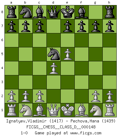 Last move : 1-0 2010 July 10 0:54:22 [Event "FICGS__CHESS__CLASS_D__000148"] [Site "FICGS"] [Date "2010.05.14"] [Round "1"] [White "Ignatyev,Vladimir"] [Black "Pechova,Hana"] [Result "1-0"] [WhiteElo "1417"] [BlackElo "1439"] 1.e4 Nf6 2.e5 Nd5 3.d4 d6 4.f4 dxe5 5.fxe5 1-0 Alekhine's defense Player White won this chess game. Follow this game move after move (download)Kasparov : J'adoube , Ivanchuk : S'il vous plaît ! (Garry Kasparov & Vassily Ivanchuk, Linares 1997) Ich brauche nur einen Blick auf das Schachbrett zu werfen, und weiß schon, was in der Stellung steckt, was geschehen kann und was geschehen wird. Alle übrigen suchen und prüfen, ich aber weiß es! (José Raúl Capablanca) Aún deseo matar a Fischer. (Boris Spassky) Dans le domaine de la peinture, de la gravure et de la sculpture, dès la première décennie de notre siècle, les artistes abandonnent la représentation de la partie d'échecs pour se concentrer sur les pièces, sur les échiquiers et sur toutes les variations auxquelles les unes et les autres peuvent donner lieu. On passe en quelque sorte d'un thème social à un thème musical (au sens de la musica médiévale, c'est-à -dire d'une notion qui inclue le rythme, l'harmonie, la construction et la déconstruction, etc.). Graphiquement et picturalement, l'échiquier apparaît comme une structure ouverte, dynamique, d'une richesse infinie, autorisant toutes les combinatoires et débouchant sur des mouvements et des rythmes de nature exponentielle. (Michel Pastoureau) Macintosh - we might not get everything right, but at least we knew the century was going to end. (Douglas Adams)