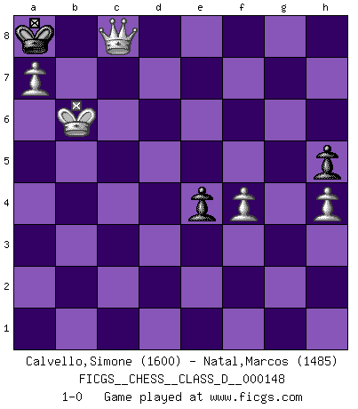 Last move : 1-0 2010 July 26 13:59:51 [Event "FICGS__CHESS__CLASS_D__000148"] [Site "FICGS"] [Date "2010.05.14"] [Round "1"] [White "Calvello,Simone"] [Black "Natal,Marcos"] [Result "1-0"] [WhiteElo "1600"] [BlackElo "1485"] 1.e4 e5 2.Nf3 Nc6 3.d4 exd4 4.Nxd4 Nf6 5.Nc3 Bc5 6.Be3 d6 7.Nxc6 bxc6 8.Bxc5 dxc5 9.Qxd8+ Kxd8 10.O-O-O Ke7 11.Bc4 a5 12.f3 Ba6 13.Bxa6 Rxa6 14.Na4 c4 15.Rd4 Rb8 16.Rxc4 Rb4 17.Rxb4 axb4 18.b3 Ra5 19.c3 bxc3 20.Nxc3 c5 21.Rd1 Nh5 22.Nd5+ Ke6 23.Nxc7+ Kf6 24.Nd5+ Kg6 25.Kb2 Kg5 26.Ne3 Nf4 27.g3 Ne6 28.Rd5+ Kg6 29.f4 Nd4 30.Rg5+ Kf6 31.Re5 Nf3 32.Ng4+ Kg6 33.Rd5 h5 34.Ne5+ Nxe5 35.Rxe5 f6 36.Rd5 Kh6 37.h4 g6 38.a3 Kg7 39.b4 Rb5 40.Rxc5 Rxc5 41.bxc5 Kf7 42.Kc3 Ke7 43.Kc4 Kd7 44.Kb5 Kc7 45.a4 Kb7 46.c6+ Kc7 47.a5 g5 48.a6 gxf4 49.gxf4 Kb8 50.Kb6 f5 51.a7+ Ka8 52.c7 fxe4 53.c8Q+ 1-0 Scotch : Schmidt variation Queenside Castling by player White (move 10) 10 pieces endgame at move 48 : White KPPPPP , Black KPPP WHITE : King + 5 Pawns BLACK : King + 3 Pawns 9 pieces endgame at move 49 : White KPPPPP , Black KPP WHITE : King + 5 Pawns BLACK : King + 2 Pawns 8 pieces endgame at move 52 : White KPPPP , Black KPP WHITE : King + 4 Pawns BLACK : King + 2 Pawns Promotion Queen by player White (move 53) Player White won this chess game. Follow this game move after move (download)In Chess, as it is played by masters, chance is practically eliminated. (Emanuel Lasker) Ich moechte nie einem Club beitreten, der Leute wie mich als Mitglieder aufnimmt. (Woody Allen) Nada excita más a Grandes Maestros aburridos que una novedad teórica. (Dominic Lawson) Comme les marins qui ont mille raisons différentes d'aller en mer, les joueurs d'échecs en ont tout autant avant de s'installer devant une table et jouer... (Vincent Bertignac, philosophe) Don't be discouraged. It's often the last key in the bunch that opens the lock. (Author unknown)