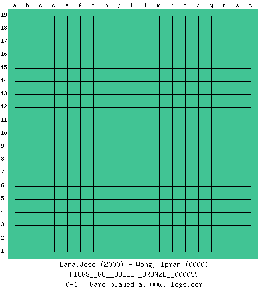 Last move : 0-1 2010 May 15 20:9:1 [Event "FICGS__GO__BULLET_BRONZE__000059"] [Site "FICGS"] [Date "2010.05.15"] [Round "1"] [Black "Lara,Jose"] [White "Wong,Tipman"] [Result "0-1"] [Rating 1 "2000"] [Rating 2 "0000"] 0-1 This go game has been lost on time (started : 2010.05.15 14:59:26) Here are the names of the openings (joseki) played in the four corners : Player White won this Go (weiqi, baduk) game. Follow this game move after move (download)Keep inessential ataris till the end. (Anonymous) I'll be back. (Arnold Schwarzenegger)