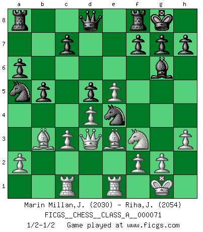 Last move : 1/2-1/2 2010 July 30 3:10:14 [Event "FICGS__CHESS__CLASS_A__000071"] [Site "FICGS"] [Date "2010.05.15"] [Round "1"] [White "Marin Millan,Jose Antonio"] [Black "Riha,Josef"] [Result "1/2-1/2"] [WhiteElo "2030"] [BlackElo "2054"] 1.e4 e5 2.Nf3 Nc6 3.Bb5 a6 4.Ba4 Nf6 5.O-O Be7 6.Re1 b5 7.Bb3 d6 8.c3 O-O 9.d4 Bg4 10.Be3 Bh5 11.h3 exd4 12.cxd4 d5 13.e5 Ne4 14.Nc3 Bb4 15.Rc1 Bxc3 16.bxc3 Na5 17.Qd3 Bg6 18.Qe2 Bh5 19.Qd3 Bg6 1/2-1/2 Ruy Lopez : Closed Kingside Castling by player White (move 5) Kingside Castling by player Black (move 8) This chess game ended in a draw. Follow this game move after move (download)For surely of all the drugs in the world, Chess must be the most permanently pleasurable. (Assiac) Ein Schachspiel besteht aus drei Phasen: Die erste, wenn du hofftst den Vorteil zu haben, die zweite, wenn du glaubst einen Vorteil zu haben, und die dritte.... wenn du weißt Du wirst verlieren. (Savielly Grigorievitsch Tartakower) Solo puedes ser bueno en el Ajedrez si amas al juego. (Bobby Fischer) La conception d'un plan est le processus par lequel un joueur exploite les avantages de sa position tout en s'efforçant d'en réduire au minimum les inconvénients. Afin de garantir le succès, un plan doit toujours se fonder sur un diagnostic objectif des particularités d'une position. La conception d'un plan est d'autant plus difficile que la position est équilibrée, et grandement facilitée lorsqu'il n'existe qu'un seul plan susceptible de répondre aux exigences de la position. (Harry Golombek) The question of whether computers can think is just like question of whether submarines can swim. (Edsger W. Dijkstra)