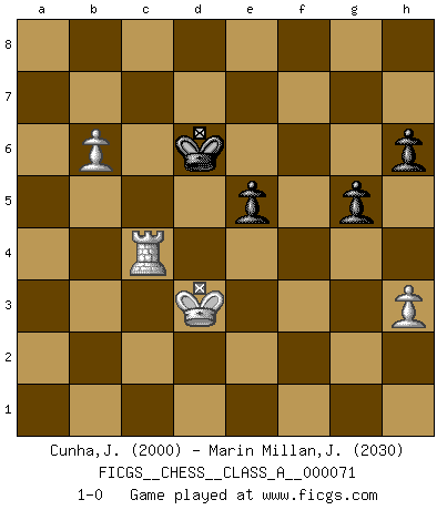 Last move : 1-0 2011 April 16 11:23:22 [Event "FICGS__CHESS__CLASS_A__000071"] [Site "FICGS"] [Date "2010.05.15"] [Round "1"] [White "Cunha,Jose"] [Black "Marin Millan,Jose Antonio"] [Result "1-0"] [WhiteElo "2000"] [BlackElo "2030"] 1.e4 e5 2.Nf3 Nc6 3.Bb5 a6 4.Ba4 Nf6 5.O-O Be7 6.Re1 b5 7.Bb3 d6 8.c3 O-O 9.h3 Nd7 10.d4 Bf6 11.a4 Bb7 12.Na3 Nb6 13.d5 Ne7 14.axb5 axb5 15.Be3 c6 16.dxc6 Bxc6 17.Qe2 Rb8 18.Rad1 Na4 19.Qc2 Qd7 20.c4 Rfc8 21.c5 Qb7 22.cxd6 Bxe4 23.Qe2 Bxf3 24.Qxf3 Qxf3 25.gxf3 Nf5 26.Rd5 Nh4 27.Re2 Nb6 28.Rxb5 Nxf3+ 29.Kf1 Nd4 30.Bxd4 exd4 31.Nc4 Nd7 32.Ba4 Ra8 33.Rb4 Ra7 34.Bxd7 Rxd7 35.Re1 Rcd8 36.Rb5 Kf8 37.b4 d3 38.Rd1 Rxd6 39.Nxd6 Rxd6 40.Rc5 Ke8 41.Ke1 Rb6 42.Rb1 Bd4 43.Rc4 Re6+ 44.Kd2 Bxf2 45.Rf1 Bh4 46.Rxh4 h6 47.Re1 Ke7 48.Rxe6+ fxe6 49.Kxd3 Kd6 50.Rc4 g5 51.b5 e5 52.b6 1-0 Ruy Lopez : Closed Kingside Castling by player White (move 5) Kingside Castling by player Black (move 8) 10 pieces endgame at move 48 : White KRRPP , Black KPPPP WHITE : King + 2 Rooks 2 Pawns BLACK : King + 4 Pawns 9 pieces endgame at move 48 : White KRPP , Black KPPPP WHITE : King + 1 Rook 2 Pawns BLACK : King + 4 Pawns 8 pieces endgame at move 49 : White KRPP , Black KPPP WHITE : King + 1 Rook 2 Pawns BLACK : King + 3 Pawns Player White won this chess game. Follow this game move after move (download)In the perfect Chess combination as in a first-rate short story, the whole plot and counter-plot should lead up to a striking finale, the interest not being allayed until the very last moment. (Yates and Winter) Garry Kasparov war erst in der Großmeister-Organisation GMA, dann in der Profischach-Vereinigung PCA, zum Schluss kehrte er wieder in den Schoß der FIDE zurück. Aber gut, manche Leute sind flexibel (Viswanathan Anand) De todos mis libros Rusos, la defensa contiene y difunde el 'calor' mas grande que pudiese verse extraño al observar lo supremamente abstracto que el Ajedrez supuestamente es. (Vladimir Nabokov) Les Echecs sont affaire de jugement sensible. Savoir quand frapper et quand esquiver. (Fischer) God is an atheist. (Unknown)