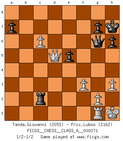 Last move : 1/2-1/2 2011 February 28 19:20:45 [Event "FICGS__CHESS__CLASS_A__000071"] [Site "FICGS"] [Date "2010.05.15"] [Round "1"] [White "Tanda,Giovanni"] [Black "Fric,Lubos"] [Result "1/2-1/2"] [WhiteElo "2055"] [BlackElo "2162"] 1.d4 Nf6 2.Nf3 d5 3.Bf4 Bf5 4.e3 e6 5.Nbd2 Bd6 6.Ne5 O-O 7.c4 Nbd7 8.Be2 dxc4 9.Bxc4 Rc8 10.Rc1 c5 11.Nxf7 Rxf7 12.Bxd6 cxd4 13.exd4 Nb6 14.Bc5 Rfc7 15.O-O Nbd5 16.b3 b6 17.Ba3 b5 18.Bxd5 Qxd5 19.Rxc7 Rxc7 20.Bc5 Nd7 21.Qh5 h6 22.b4 Nxc5 23.bxc5 Qxd4 24.Nb3 Qd3 25.h3 Kh7 26.Rd1 Qe4 27.Qe8 Rc6 28.f3 Qe3+ 29.Kh1 Ra6 30.Nd4 Rxa2 31.Nxf5 Qe2 32.Ne3 Qxe3 33.Qxb5 Rc2 34.c6 e5 35.Qd5 Qg5 36.Rg1 Qg6 1/2-1/2 Queen's pawn game Kingside Castling by player Black (move 6) Kingside Castling by player White (move 15) This chess game ended in a draw. Follow this game move after move (download)Fischer wanted to give the Russians a taste of their own medicine. (Larry Evans) Im Schach gewinnt jeder. Hat man Freunde am Spiel - und das ist die Hauptsache - ist auch der Verlust einer Partie kein Unglück. (David Bronstein) ¿Esta Bobby Fischer algo cuerdo?. (Salo Flohr) Karpov est une pièce de musée. (Garry Kasparov) You can only get smarter by playing a smarter opponent. (Revolver, movie)