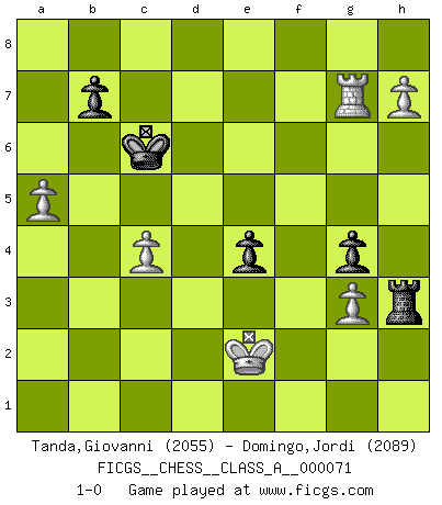 Last move : 1-0 2012 March 3 20:58:8 [Event "FICGS__CHESS__CLASS_A__000071"] [Site "FICGS"] [Date "2010.05.15"] [Round "1"] [White "Tanda,Giovanni"] [Black "Domingo,Jordi"] [Result "1-0"] [WhiteElo "2055"] [BlackElo "2089"] 1.d4 Nf6 2.Nc3 d6 3.e4 h6 4.Nf3 g5 5.e5 dxe5 6.Nxe5 Be6 7.h4 g4 8.Bb5+ c6 9.Bc4 Bxc4 10.Nxc4 Nbd7 11.Bf4 Nb6 12.Ne5 h5 13.O-O e6 14.Bg5 Be7 15.Qd3 Nbd7 16.f4 c5 17.Rad1 cxd4 18.Qxd4 Qb6 19.Qxb6 axb6 20.Nb5 Rc8 21.c4 Rh7 22.b3 Nxe5 23.Bxf6 Bc5+ 24.Kh2 Nd7 25.Bd4 Rc6 26.Rfe1 Be7 27.g3 Nc5 28.Be5 f6 29.Bb8 Nd7 30.Nc7+ Kd8 31.Nxe6+ Kc8 32.Ba7 Bb4 33.Re2 Re7 34.f5 Rc5 35.Rd5 Ra5 36.Rxa5 Bxa5 37.Kg2 Bb4 38.a4 Re8 39.Re3 Bd6 40.Rd3 Bc7 41.Rd2 Nf8 42.Ng7 Re5 43.b4 Nd7 44.Nxh5 Rxf5 45.Nf4 Bxf4 46.Rf2 Re5 47.Rxf4 Re2+ 48.Rf2 Re4 49.Rf4 Re2+ 50.Kg1 Re1+ 51.Kf2 Ra1 52.h5 Rh1 53.Rf5 Kc7 54.Kg2 Re1 55.a5 bxa5 56.bxa5 Kd6 57.h6 Re2+ 58.Kf1 Re7 59.Rb5 Kc7 60.Kf2 Ne5 61.Be3 Kc8 62.Rd5 Rh7 63.Rd6 Rf7 64.Bd4 Kc7 65.Re6 Kd7 66.Rb6 Kc7 67.Bxe5+ fxe5 68.Ke2 Rf5 69.Rg6 Rh5 70.Rg7+ Kc6 71.h7 Rh3 72.Kf2 e4 73.Ke2 1-0 Queen's pawn game Kingside Castling by player White (move 13) Player White won this chess game. Follow this game move after move (download)Chess is above all, a fight ! (Emanuel Lasker) Wenn Schach ein enormer Dschungel ist, der seine Myriaden von Geheimnissen nicht preisgeben will, dann sind Computer die Kettensägen einer gewaltigen ökologisch unsensiblen Nutzholzfirma. (Nigel Short) El Ajedrez era la lengua materna de Capablanca. (Reti) Le génie consiste à savoir transgresser les règles au moment opportun. (Teichmann) History is a gallery of pictures in which there are few originals and many copies. (Alexis de Tocqueville)