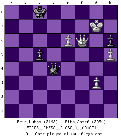 Last move : 1-0 2010 October 20 14:16:48 [Event "FICGS__CHESS__CLASS_A__000071"] [Site "FICGS"] [Date "2010.05.15"] [Round "1"] [White "Fric,Lubos"] [Black "Riha,Josef"] [Result "1-0"] [WhiteElo "2162"] [BlackElo "2054"] 1.c4 Nf6 2.d4 e6 3.Nf3 b6 4.g3 Bb7 5.Bg2 Bb4+ 6.Nc3 Bxc3+ 7.bxc3 O-O 8.Bg5 d6 9.Bxf6 Qxf6 10.Qd3 Qh6 11.O-O f5 12.Nh4 Bxg2 13.Nxg2 Nd7 14.a4 Nf6 15.a5 Kh8 16.f3 g5 17.axb6 axb6 18.c5 dxc5 19.dxc5 Rad8 20.Qc4 bxc5 21.Qxc5 Qg7 22.Rfd1 Nd5 23.Ra6 Rde8 24.Rc6 Re7 25.Ne3 Nxe3 26.Qxe3 e5 27.Qc5 Rfe8 28.Ra1 g4 29.Ra7 Rc8 30.fxg4 fxg4 31.Ra1 Rce8 32.Rf1 Rd8 33.Kg2 Rb8 34.Rf5 Ra8 35.Rcf6 Rae8 36.Qf2 Kg8 37.Qg1 Kh8 38.Qf1 Kg8 39.Qf2 Rd8 40.Qe3 Kh8 41.Rxe5 Rde8 42.Rfe6 Rxe6 43.Rxe6 Rxe6 44.Qxe6 Qxc3 45.Qc8+ Kg7 46.Qxg4+ Kh8 47.h4 Qc6+ 48.e4 h6 49.Qf5 Kg7 50.Qe5+ Kf7 51.h5 Kf8 52.Kh3 Qb6 53.Kg4 Kf7 54.Qf5+ Ke7 55.Qh7+ Kd8 56.Qg8+ Kd7 57.Qf7+ Kd8 58.Kf5 Qe3 59.e5 c5 60.Qg8+ Ke7 61.Qg7+ Ke8 62.Qg6+ Kd7 63.Kf6 Qf2+ 64.Kg7 Qd4 65.Qf6 Qe3 66.Qf7+ Kc8 67.e6 Qd4+ 68.Qf6 1-0 English, 1...Nf6 (Anglo-Indian defense) Kingside Castling by player Black (move 7) Kingside Castling by player White (move 11) 10 pieces endgame at move 44 : White KQPPP , Black KQPPP WHITE : King + 1 Queen 3 Pawns BLACK : King + 1 Queen 3 Pawns 9 pieces endgame at move 46 : White KQPPP , Black KQPP WHITE : King + 1 Queen 3 Pawns BLACK : King + 1 Queen 2 Pawns Player White won this chess game. Follow this game move after move (download)Could we look into the head of a Chess player, we should see there a whole world of feelings, images, ideas, emotion and passion. (Alfred Binet) Kleine Schachspieler machen Mist, und große Schachspieler machen Mist, aber große machen weniger Mist. (Fritz Sämisch) Preferería tener un Peón que un dedo. (Reuben Fine) Même si l'adversaire joue le coup analysé précédemment, recommencez l'analyse en voyant la nouvelle position. Première règle de Blumenfeld All maxims have their antagonist maxims; proverbs should be sold in pairs, a single one being but a half truth. (William Mathews)