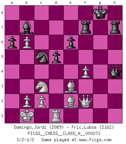 Last move : 1/2-1/2 2011 January 18 23:51:4 [Event "FICGS__CHESS__CLASS_A__000071"] [Site "FICGS"] [Date "2010.05.15"] [Round "1"] [White "Domingo,Jordi"] [Black "Fric,Lubos"] [Result "1/2-1/2"] [WhiteElo "2089"] [BlackElo "2162"] 1.e4 e6 2.d4 d5 3.Nc3 Nf6 4.e5 Nfd7 5.f4 c5 6.Nf3 Nc6 7.Be3 Be7 8.dxc5 O-O 9.Qd2 Nxc5 10.O-O-O Qc7 11.Kb1 b6 12.Qe1 Bb7 13.h4 a6 14.h5 h6 15.Rg1 Rae8 16.g4 f6 17.Qg3 fxe5 18.Nxe5 Nxe5 19.g5 Nf3 20.gxh6 Rf7 21.hxg7 Nxg1 22.h6 Bf6 23.Qxg1 Bxg7 24.Be2 R8e7 25.hxg7 Rxg7 26.Qh2 Ref7 27.a4 Rh7 28.Qf2 Qe7 29.a5 Qh4 30.axb6 1/2-1/2 French : Steinitz, Boleslavsky variation Kingside Castling by player Black (move 8) Queenside Castling by player White (move 10) This chess game ended in a draw. Follow this game move after move (download)No Chess Grandmaster is normal; they only differ in the extent of their madness. (Viktor Korchnoi) Kostenjuk hat keinen Sexappeal. (Loek van Wely) Bobby Fischer es el jugador de Ajedrez mas grande que jamás haya existido. (Ken Smith) Les échecs sont plus proches de l'art de l'assassinat que de l'art de la guerre. (Arturo Perez-Reverte) Plans are ideas that never come to fruition. (Daniel Parmet)