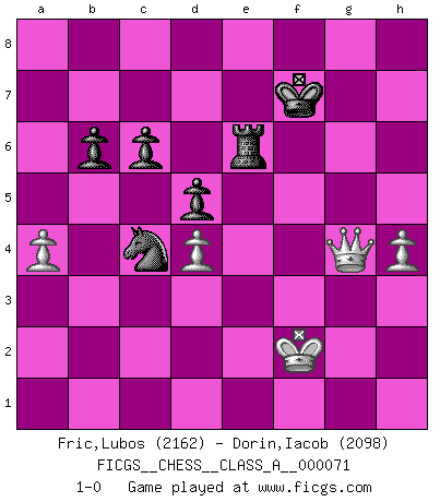 Last move : 1-0 2010 October 25 20:20:51 [Event "FICGS__CHESS__CLASS_A__000071"] [Site "FICGS"] [Date "2010.05.15"] [Round "1"] [White "Fric,Lubos"] [Black "Dorin,Iacob"] [Result "1-0"] [WhiteElo "2162"] [BlackElo "2098"] 1.c4 Nf6 2.d4 e6 3.Nf3 b6 4.g3 Bb7 5.Bg2 Qc8 6.Nc3 Bb4 7.O-O Bxc3 8.bxc3 d6 9.Re1 O-O 10.Bh3 Qe8 11.Nd2 Nc6 12.e4 Na5 13.Bf1 e5 14.Bd3 Ba6 15.f4 exf4 16.gxf4 Qc6 17.Ba3 g6 18.Bb4 Rfe8 19.e5 Bxc4 20.Nxc4 Nxc4 21.exf6 a5 22.f5 axb4 23.Qg4 d5 24.fxg6 hxg6 25.Bxg6 Rxe1+ 26.Rxe1 Qxf6 27.Bxf7+ Kxf7 28.Qd7+ Kf8 29.Rf1 Qxf1+ 30.Kxf1 bxc3 31.Ke1 c2 32.Qf5+ Kg7 33.Qxc2 Re8+ 34.Kf2 Re4 35.Qd1 c6 36.a4 Re6 37.Qg4+ Kf7 38.h4 1-0 English, 1...Nf6 (Anglo-Indian defense) Kingside Castling by player White (move 7) Kingside Castling by player Black (move 9) Player White won this chess game. Follow this game move after move (download)When I asked Fischer why he had not played a certain move in our game, he replied: 'Well, you laughed when I wrote it down !' (Mikhail Tal) Darum geht es im Schach. Einen Tag gibst du deinem Gegner eine Lektion, am nächsten Tag gibt er dir eine. (Robert James Fischer) El Ajedrez detiene a su maestro dentro de sus propios vínculos, encadenando la mente y el cerebro, por lo que la libertad interior del mas fuerte debe sufrir. (Albert Einstein) Nous sommes les pions de la mystérieuse partie d'Echecs jouée par Dieu. Il nous déplace, nous arrête, nous pousse encore, puis nous lance un à un dans la boîte du Néant. Epitaphe sur la tombe de David Janowsky (1868-1927). If you have any trouble condescending, find a Unix user to show you how it's done. (Scott Adams)