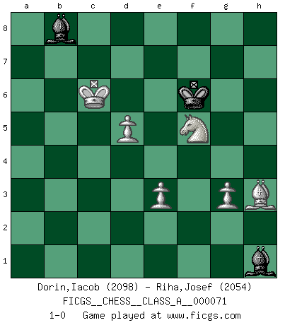 Last move : 1-0 2010 July 2 15:12:6 [Event "FICGS__CHESS__CLASS_A__000071"] [Site "FICGS"] [Date "2010.05.15"] [Round "1"] [White "Dorin,Iacob"] [Black "Riha,Josef"] [Result "1-0"] [WhiteElo "2098"] [BlackElo "2054"] 1.Nf3 f5 2.c4 d6 3.d4 Nf6 4.Nc3 g6 5.g3 Bg7 6.Bg2 Nc6 7.O-O O-O 8.Qc2 e6 9.a3 d5 10.cxd5 exd5 11.Bg5 Be6 12.Rac1 Qd7 13.Na4 Ne4 14.Nc5 Nxc5 15.Qxc5 h6 16.Bd2 g5 17.e3 a6 18.Qc2 Rab8 19.h4 Qe7 20.hxg5 hxg5 21.Qb3 Qd8 22.Rc5 Kh8 23.Rfc1 Bh6 24.Qc2 Bg7 25.b4 Bf6 26.Qb3 Qd6 27.a4 g4 28.Ne1 Ne7 29.Nd3 c6 30.b5 axb5 31.axb5 Rfe8 32.Bb4 Qc7 33.R5c3 Bg5 34.Qc2 Rbc8 35.Ra1 Kg8 36.Bxe7 Bxe7 37.bxc6 bxc6 38.Ra6 Qd7 39.Ne5 Qb7 40.Raxc6 Rxc6 41.Rxc6 Rc8 42.Rxc8+ Qxc8 43.Qxc8+ Bxc8 44.Bxd5+ Kg7 45.Nd3 Ba6 46.Nf4 Kf6 47.Kg2 Bd6 48.f3 gxf3+ 49.Kxf3 Bc8 50.Nd3 Be7 51.Nc5 Bf8 52.Ke2 Bd6 53.Kf2 Bf8 54.Bg2 Bg7 55.Bh3 Ke7 56.Nd3 Kf6 57.Nf4 Kg5 58.Ke1 Bh8 59.Kd2 Bb7 60.Kc3 Bf3 61.Kc4 Bf6 62.d5 Be7 63.Kb5 Bd6 64.Kc6 Bb8 65.Ne6+ Kf6 66.Nd4 Bh1 67.Nxf5 1-0 Reti v Dutch Kingside Castling by player White (move 7) Kingside Castling by player Black (move 7) 10 pieces endgame at move 49 : White KBNPPP , Black KBBP WHITE : King + 1 Bishop 1 Knight 3 Pawns BLACK : King + 2 Bishops 1 Pawn 9 pieces endgame at move 67 : White KBNPPP , Black KBB WHITE : King + 1 Bishop 1 Knight 3 Pawns BLACK : King + 2 Bishops Player White won this chess game. Follow this game move after move (download)Chess is ruthless: you've got to be prepared to kill people. (Nigel Short) Sitze auf Deine Hände. (Siegbert Tarrasch) La esencia del Ajedrez es pensar acerca de lo que el Ajedrez es. (David Bronstein) Aux échecs, l'amour-propre est satisfait quand on remporte la victoire, mais il n'y a pas de honte à être battu. (Benjamin Franklin) A married woman is like a fish riding a bicycle. (Rodolfo d'Ettorre)