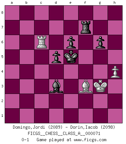 Last move : 0-1 2010 December 30 14:56:16 [Event "FICGS__CHESS__CLASS_A__000071"] [Site "FICGS"] [Date "2010.05.15"] [Round "1"] [White "Domingo,Jordi"] [Black "Dorin,Iacob"] [Result "0-1"] [WhiteElo "2089"] [BlackElo "2098"] 1.e4 c6 2.d4 d5 3.e5 Bf5 4.Nc3 e6 5.g4 Bg6 6.Nge2 c5 7.h4 h6 8.Be3 Ne7 9.f4 Nec6 10.Bg2 cxd4 11.Nxd4 Nxd4 12.Qxd4 Nc6 13.Qa4 Bb4 14.Bd2 O-O 15.O-O-O a5 16.f5 Bh7 17.a3 Qc7 18.Kb1 h5 19.Rhf1 Nd4 20.Be1 b5 21.Nxb5 Nxb5 22.axb4 Rfb8 23.bxa5 Nc3+ 24.Bxc3 Qxc3 25.Qe8+ Rxe8 26.bxc3 hxg4 27.Rf4 Rxa5 28.fxe6 fxe6 29.Rxg4 Rea8 30.Rd2 Ra1+ 31.Kb2 R8a2+ 32.Kb3 Ra3+ 33.Kb2 R1a2+ 34.Kc1 Rxc3 35.Kd1 Bxc2+ 36.Ke1 Re3+ 37.Kf2 Rxe5 38.Rb4 Kf7 39.Bh3 g6 40.Bg4 Bb3 41.Rxa2 Bxa2 42.Bf3 Bc4 43.Rb7+ Kf6 44.Rd7 Rf5 45.Kg3 Ke5 46.Rc7 Bd3 47.Rc6 Rf7 0-1 Caro-Kann : Advance variation Kingside Castling by player Black (move 14) Queenside Castling by player White (move 15) 10 pieces endgame at move 41 : White KRBP , Black KRBPPP WHITE : King + 1 Rook 1 Bishop 1 Pawn BLACK : King + 1 Rook 1 Bishop 3 Pawns Player Black won this chess game. Follow this game move after move (download)Play the opening like a book, the middle game like a magician, and the endgame like a machine. (Spielmann) Ich hatte Zahnschmerzen im ersten Spiel. In der zweiten Partie tat mir der Kopf weh. In der dritten war es eine Rheuma-Attacke und während der vierten fühlte ich mich nicht gut. Und in der fünften? Nun, man muss doch nicht jedes Spiel gewinnen, oder? (Savielly Grigorievitsch Tartakower) Debes de llevar a tu oponente hacia un profundo y obscuro bosque donde 2+2=5, y el camino que conduce a la salida es suficientemente ancho para solamente uno. (Mikhail Tal) Les ravages du H expliquent la différence de niveau entre Tal et Thal [Abergel]. A journey of a thousand sites begins with a single click. (Author unknown)