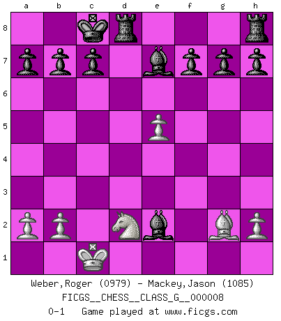 Last move : 0-1 2007 March 19 19:27:11 [Event "FICGS__CHESS__CLASS_G__000008"] [Site "FICGS"] [Date "2006.11.02"] [Round "1"] [White "Weber,Roger"] [Black "Mackey,Jason"] [Result "0-1"] [WhiteElo "0979"] [BlackElo "1085"] 1.e4 e5 2.f4 exf4 3.d4 Qh4+ 4.g3 fxg3 5.Nf3 g2 6.Nxh4 gxh1Q 7.Qe2 d6 8.Bf4 Be7 9.Nf3 Bg4 10.Nbd2 Bh4+ 11.Kd1 Ne7 12.c3 Ng6 13.Be3 Nd7 14.Kc2 Be7 15.Rc1 Nh4 16.Bf4 Nxf3 17.Bg2 Nxd4+ 18.cxd4 Qxc1+ 19.Kxc1 Bxe2 20.e5 dxe5 21.Bxe5 Nxe5 22.dxe5 O-O-O 0-1 KGA : Villemson (Steinitz) gambit Promotion Queen by player Black (move 6) Queenside Castling by player Black (move 22) Player Black won this chess game. Follow this game move after move (download)Mistrust is the most necessary characteristic of the Chess player. (Siegbert Tarrasch) Irgendwie scheint mir sonntags früh um 9 Uhr der Killerinstinkt verloren gegangen zu sein. (Alexej Shirov) Cada Peón es una Reina en potencia. (James Mason) Tout change constamment, y compris dans le monde des Echecs. (Botvinnik) The good fighters of old first put themselves beyond the possibility of defeat, and then waited for an opportunity of defeating the enemy. (Sun Tzu)