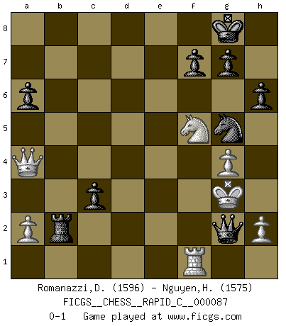 Last move : 0-1 2010 August 13 22:38:44 [Event "FICGS__CHESS__RAPID_C__000087"] [Site "FICGS"] [Date "2010.05.16"] [Round "1"] [White "Romanazzi,Dante"] [Black "Nguyen,Hao Nhien"] [Result "0-1"] [WhiteElo "1596"] [BlackElo "1575"] 1.d4 Nf6 2.Nc3 d5 3.e3 e6 4.Bd3 Bd6 5.Nge2 O-O 6.Ng3 c5 7.O-O Nc6 8.f3 h6 9.Bb5 a6 10.Bxc6 bxc6 11.Nce2 cxd4 12.exd4 c5 13.Be3 cxd4 14.Bxd4 e5 15.Bf2 Rb8 16.Nc3 Be6 17.b3 Qc7 18.Na4 Rfc8 19.c3 Bd7 20.Rc1 Bxa4 21.bxa4 Bc5 22.Nf5 Bxf2+ 23.Rxf2 Qd7 24.g4 Rc4 25.Ne3 Rxa4 26.Rd2 d4 27.Nf5 Qa7 28.Qxa4 dxc3 29.Rf2 Rb2 30.Rcf1 e4 31.Kg2 exf3+ 32.Kxf3 Qb7+ 33.Kg3 Ne4+ 34.Kg2 Nxf2 35.Kg3 Ne4+ 36.Kh3 Ng5+ 37.Kg3 Qg2+ 0-1 This chess game has been lost on time (started : 2010.05.16 18:51:52) Queen's pawn game Kingside Castling by player Black (move 5) Kingside Castling by player White (move 7) Player Black won this chess game. Follow this game move after move (download)A man without frontiers. He didn't divide the East and the West, he brought them together in their admiration for him. (Ljubomir Ljubojevic, about Bobby Fischer's death) Mein Gehirn das ist mein zweitwichtigstes Organ [Aus dem Film: Der Schläfer]. (Woody Allen) La maestría del Ajedrez consiste esencialmente en analizar posiciónes de Ajedrez con precisión. (Mikhail Botvinnik) La tactique, c'est ce que vous faites quand il y a quelque chose à faire; la stratégie, c'est ce que vous faites quand il n'y a rien à faire. (Savielli Tartacower) If you are good, you will be assigned all the work. If you are really good, you will get out of it. (Dan Rotaru)