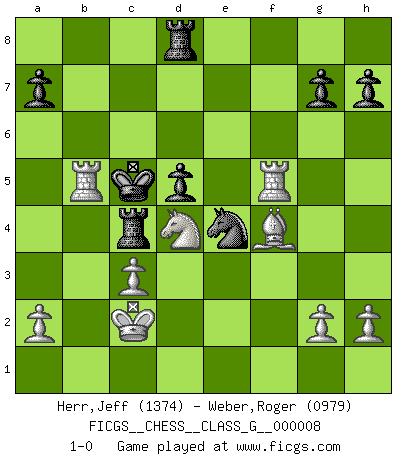 Last move : 1-0 2006 November 29 21:10:22 [Event "FICGS__CHESS__CLASS_G__000008"] [Site "FICGS"] [Date "2006.11.02"] [Round "1"] [White "Herr,Jeff"] [Black "Weber,Roger"] [Result "1-0"] [WhiteElo "1374"] [BlackElo "0979"] 1.d4 d5 2.c4 Nc6 3.e3 e5 4.dxe5 Nxe5 5.cxd5 Nf6 6.e4 Nxe4 7.Qa4+ c6 8.Qxe4 Qxd5 9.Qxd5 cxd5 10.Bb5+ Bd7 11.Bxd7+ Kxd7 12.Ne2 Nd3+ 13.Kd2 Nxf2 14.Rf1 Bb4+ 15.Nbc3 Ne4+ 16.Kc2 Rac8 17.Rxf7+ Ke6 18.Rxb7 Bxc3 19.bxc3 Rhd8 20.Nd4+ Kf6 21.Bd2 Rc4 22.Rf1+ Ke5 23.Rf5+ Kd6 24.Bf4+ Kc5 25.Rb5+ 1-0 QGD : Chigorin defense Player White won this chess game. Follow this game move after move (download)Weak points or holes in the opponent's position must be occupied by pieces not Pawns. (Siegbert Tarrasch) Gewinnen beim Schach fördert das Selbstvertrauen. Beim Sex spüre ich sowas nicht... (Garry Kasparov) Solo puedes ser bueno en el Ajedrez si amas al juego. (Bobby Fischer) On peut tirer plus d'utilité d'une partie perdue que de 100 parties gagnées. (Capablanca) Establishing goals is all right if you don't let them deprive you of interesting detours. (Doug Larson)