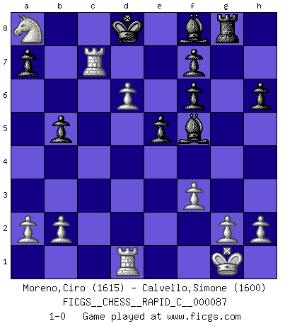 Last move : 1-0 2010 September 1 22:59:7 [Event "FICGS__CHESS__RAPID_C__000087"] [Site "FICGS"] [Date "2010.05.16"] [Round "1"] [White "Moreno,Ciro"] [Black "Calvello,Simone"] [Result "1-0"] [WhiteElo "1615"] [BlackElo "1600"] 1.c4 c5 2.e3 Nc6 3.d4 cxd4 4.exd4 d5 5.cxd5 Qxd5 6.Nf3 Bg4 7.Nc3 Bxf3 8.Nxd5 Bxd1 9.Nc7+ Kd7 10.Nxa8 Bh5 11.d5 Nb4 12.Bb5+ Kd8 13.O-O Nc2 14.Rb1 Bg6 15.Ba4 b5 16.Bxc2 Bxc2 17.Ra1 Nf6 18.Bg5 h6 19.Bxf6 gxf6 20.Rac1 Be4 21.f3 Bf5 22.Rc7 e5 23.d6 Rg8 24.Rd1 1-0 This chess game has been lost on time (started : 2010.05.16 18:51:52) English : Symmetrical variation Kingside Castling by player White (move 13) Player White won this chess game. Follow this game move after move (download)In Chess, just as in life, today's bliss may be tomorrow's poison. (Assaic) Es gibt keine einzige Frau, der ich nicht einen Springer vorgeben könnte und trotzdem gewänne. (Robert James Fischer) Algunos sacrificios son sólidos, los demás son míos. (Mikhail Tal) Même un GMI sait rarement calculer sur plus de cinq coups une attaque à sacrifices. (Rudolf Spielmann) You lose, general Kenobi. (General Grievous in Star Wars ep.3)