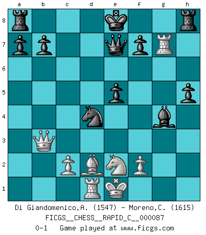 Last move : 0-1 2010 July 15 22:55:35 [Event "FICGS__CHESS__RAPID_C__000087"] [Site "FICGS"] [Date "2010.05.16"] [Round "1"] [White "Di Giandomenico,Alfonso"] [Black "Moreno,Ciro"] [Result "0-1"] [WhiteElo "1547"] [BlackElo "1615"] 1.e4 c5 2.Nf3 e6 3.d4 cxd4 4.Nxd4 Nf6 5.Nc3 Bb4 6.Bd3 d5 7.e5 Nfd7 8.Bf4 Qb6 9.Nde2 d4 10.a3 dxc3 11.axb4 cxb2 12.Rb1 Qxb4+ 13.Bd2 Qg4 14.Bc3 Qxg2 15.Rg1 Qxh2 16.Rxg7 Nxe5 17.Be4 Nbd7 18.Rxb2 h5 19.Qd2 Nc5 20.Qe3 Nxe4 21.Qxe4 Nc6 22.Qf3 Qc7 23.Rb1 e5 24.Rd1 Qe7 25.Bd2 Bg4 26.Qb3 Nd4 0-1 Sicilian : Pin variation (Sicilian counter-attack) Player Black won this chess game. Follow this game move after move (download)Winning isn't everything... but losing is nothing. (Mednis) Ich bin stolz ein Bulgare zu sein. (Veselin Topalov) El Jaque al descubierto es el bombardero del tablero. (Reuben Fine) Psychologiquement, tu dois avoir confiance en toi même, mais cette confiance doit être basée sur des faits. (Robert Fischer) Players are not good because they find tactics, it is about the way to find the positions in which those tactics are hidden. (Luc-Olivier Leclerc)