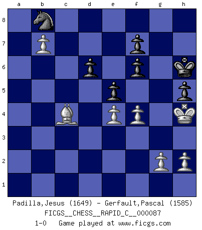 Last move : 1-0 2010 August 9 8:56:41 [Event "FICGS__CHESS__RAPID_C__000087"] [Site "FICGS"] [Date "2010.05.16"] [Round "1"] [White "Padilla,Jesus"] [Black "Gerfault,Pascal"] [Result "1-0"] [WhiteElo "1649"] [BlackElo "1585"] 1.e4 c5 2.Nf3 Nc6 3.d4 cxd4 4.Nxd4 e5 5.Nb5 d6 6.N1c3 Nf6 7.Bg5 a6 8.Na3 b5 9.Nd5 Be7 10.Bxf6 Bxf6 11.c4 bxc4 12.Nxc4 Nd4 13.Ncb6 Rb8 14.Nxc8 Rxc8 15.Qa4+ Kf8 16.Bd3 a5 17.O-O Rc5 18.a3 Qc8 19.Nb6 Qc6 20.Nd7+ Ke7 21.Qxc6 Rxc6 22.Nxf6 gxf6 23.Rfc1 Rhc8 24.Rxc6 Rxc6 25.f3 Nb3 26.Rd1 Nd4 27.Kf2 Rb6 28.Rd2 Rc6 29.Kg3 Nb3 30.Rc2 Rxc2 31.Bxc2 Nd4 32.Bd3 Kf8 33.b4 axb4 34.axb4 Nc6 35.b5 Nb8 36.b6 Kg7 37.Kg4 Kg6 38.b7 Nd7 39.f4 h5+ 40.Kg3 Nb8 41.Kh4 Kh6 42.Bc4 1-0 Sicilian : Labourdonnais-Loewenthal (Kalashnikov) variation Kingside Castling by player White (move 17) Player White won this chess game. Follow this game move after move (download)No price is too great for the scalp of the enemy King. (Koblentz) Jeder weiß, dass Gasprom Putins persönliches Machtinstrument ist. Die Firma wird vom Kreml aus geleitet und wird schon deshalb nie transparent sein. (Garry Kasparov) Aquel que ve no otra dirección en el juego que la de dar Jaque Mate a su oponente, nunca será un buen jugador de Ajedrez. (Euwe) On croit qu'il y a plus de mauvais joueurs que de bons joueurs, c'est faux : Il y a autant de joueurs qui gagnent que de joueurs qui perdent. (Philippe Geluck) Creativity is allowing yourself to make mistakes. Art is knowing which ones to keep. (Scott Adams)