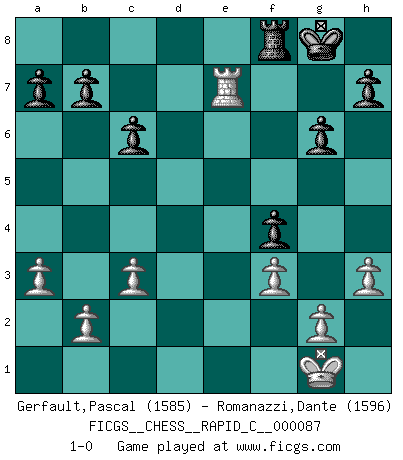 Last move : 1-0 2010 August 13 22:38:44 [Event "FICGS__CHESS__RAPID_C__000087"] [Site "FICGS"] [Date "2010.05.16"] [Round "1"] [White "Gerfault,Pascal"] [Black "Romanazzi,Dante"] [Result "1-0"] [WhiteElo "1585"] [BlackElo "1596"] 1.e4 e5 2.Nf3 d6 3.d4 f6 4.Bc4 c6 5.dxe5 Qe7 6.O-O dxe5 7.Be3 Be6 8.Bxe6 Qxe6 9.Qe2 Ne7 10.Nc3 Ng6 11.Rfd1 Bb4 12.Rd3 O-O 13.Rad1 Na6 14.a3 Bxc3 15.Rxc3 Rad8 16.Rcd3 Rxd3 17.Rxd3 Qa2 18.c3 Nf4 19.Bxf4 Nc5 20.Rd1 exf4 21.h3 Qe6 22.Nd2 Rd8 23.f3 f5 24.Re1 fxe4 25.Nxe4 Nxe4 26.Qxe4 Qb3 27.Qe7 Rf8 28.Qe6+ Qxe6 29.Rxe6 g6 30.Re7 1-0 This chess game has been lost on time (started : 2010.05.16 18:51:52) Philidor's defense Kingside Castling by player White (move 6) Kingside Castling by player Black (move 12) Player White won this chess game. Follow this game move after move (download)Bobby Fischer's current state of mind is indeed a tragedy. One of the world's greatest Chess players - the pride and sorrow of American Chess. (Frank Brady) Ein bischen Romantik kann weder im Schach noch in der Liebe schaden. Also versuche ich mich ab und zu daran zu erinnern. (Nigel Short) Alekhine es un poeta que crea un trabajo de arte de algo que raramente inspiraría a otra persona a mandar una tarjeta postal. (Max Euwe) Les ravages du H expliquent la différence de niveau entre Tal et Thal [Abergel]. Perseverance does not equal worthiness. Next time you want to get my attention, wear something fun. Low-riding jeans are hot. (Gregory House, House M.D.)