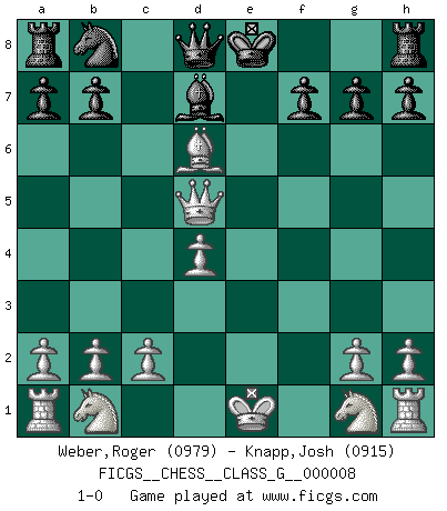 Last move : 1-0 2007 January 23 12:57:19 [Event "FICGS__CHESS__CLASS_G__000008"] [Site "FICGS"] [Date "2006.11.02"] [Round "1"] [White "Weber,Roger"] [Black "Carlo,John"] [Result "1-0"] [WhiteElo "0979"] [BlackElo "0915"] 1.e4 e5 2.f4 exf4 3.d4 Nf6 4.e5 Nd5 5.Qf3 c6 6.Bc4 Be7 7.Bxd5 cxd5 8.Bxf4 d6 9.Qxd5 Bd7 10.exd6 Bxd6 11.Bxd6 1-0 KGA : Villemson (Steinitz) gambit Player White won this chess game. Follow this game move after move (download)Different people feel differently about resigning. (Bobby Fischer) Wie, soll nun auch die Opposition abgeschafft werden? Ja, es tut mir leid, Ihnen diesen Schmerz nicht ersparen zu können. (Aaron Nimzowitsch) El Ajedrez es un expediente tonto que hace creer a la gente inactiva que hacen una cosa muy astuta cuando solamente estan perdiendo su tiempo. (George Bernard Shaw) Le moment que je préfère le plus dans une rencontre, c'est celui où je sens que la personnalité de l'adversaire se brise. (Robert Fischer) Now you put water in a cup, it becomes the cup; You put water into a bottle it becomes the bottle; You put it in a teapot it becomes the teapot. Water can flow or it can crash. Be water, my friend. (Bruce Lee)