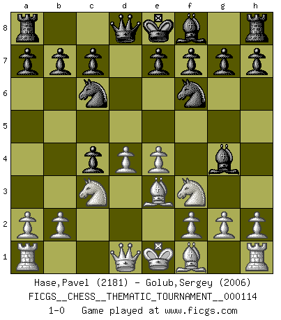 Last move : 1-0 2010 July 6 18:51:50 [Event "FICGS__CHESS__THEMATIC_TOURNAMENT__000114"] [Site "FICGS"] [Date "2010.05.16"] [Round "1"] [White "Hase,Pavel"] [Black "Golub,Sergey"] [Result "1-0"] [WhiteElo "2181"] [BlackElo "2006"] 1.d4 d5 2.c4 Nc6 3.Nc3 dxc4 4.Nf3 Nf6 5.e4 Bg4 6.Be3 1-0 This chess game has been lost on time (started : 2010.05.16 20:44:32) QGD : Chigorin defense, Janowski variation Player White won this chess game. Follow this game move after move (download)Chess is the art of analysis. (Mikhail Botvinnik) Nicht daß Diemer aus Opportunismus Mitglied der NSDAP geworden wäre. Er war ein Fanatiker, in allem, was er tat. (Hans Ree) El Ajedrez es un invernadero donde los frutos del carácter pueden madurar mas completamente que en la vida. (Edward Morgan Foster) Les échecs, c'est la lutte contre l'erreur. (Johannes Zukertort) Shallow men believe in luck. Strong men belive in cause and effect. (Ralph Waldo Emerson)