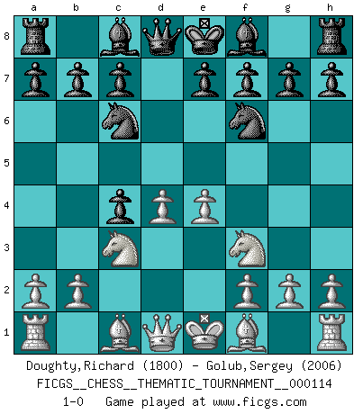 Last move : 1-0 2010 August 6 22:14:17 [Event "FICGS__CHESS__THEMATIC_TOURNAMENT__000114"] [Site "FICGS"] [Date "2010.05.16"] [Round "1"] [White "Doughty,Richard"] [Black "Golub,Sergey"] [Result "1-0"] [WhiteElo "1800"] [BlackElo "2006"] 1.d4 d5 2.c4 Nc6 3.Nc3 dxc4 4.Nf3 Nf6 5.e4 1-0 This chess game has been lost on time (started : 2010.05.16 20:44:32) QGD : Chigorin defense, Janowski variation Player White won this chess game. Follow this game move after move (download)Via the squares on the chessboard, the Indians explain the movement of time and the age, the higher influences which control the world and the ties which link Chess with the human soul. (Al-Masudi) Charakterschwächen offenbaren sich normalerweise während einer Schachpartie. (Garry Kasparov) No hay precio que sea tan grande por la cabellera del Rey enemigo. (Koblentz) Ce qui caractérise les parties de combat, c'est que si le défenseur a constamment de difficiles problèmes à résoudre, l'attaquant doit chercher sans relâche de nouvelles possibilités d'attaque. (Koblentz) Employ the attack like tactic of defense. (Chinese proverb)