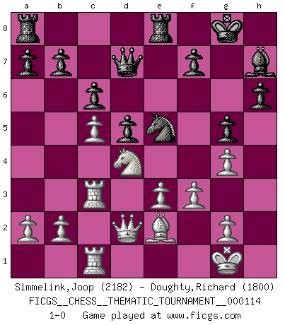 Last move : 1-0 2010 September 22 21:2:50 [Event "FICGS__CHESS__THEMATIC_TOURNAMENT__000114"] [Site "FICGS"] [Date "2010.05.16"] [Round "1"] [White "Simmelink,Joop"] [Black "Doughty,Richard"] [Result "1-0"] [WhiteElo "2182"] [BlackElo "1800"] 1.d4 d5 2.c4 Nc6 3.Nf3 Bg4 4.Nc3 e6 5.cxd5 exd5 6.Bf4 Bd6 7.Bg3 Nf6 8.e3 O-O 9.Bh4 h6 10.Be2 g5 11.Bg3 Bf5 12.O-O Re8 13.Bb5 Bxg3 14.hxg3 Qd6 15.Rc1 Nd7 16.Na4 Ne7 17.Nc5 c6 18.Be2 Nxc5 19.dxc5 Qf6 20.Nd4 Bh7 21.g4 Ng6 22.Rc3 Ne5 23.Qd2 Qe7 24.Rfc1 Qd7 25.f3 1-0 QGD : Chigorin defense Kingside Castling by player Black (move 8) Kingside Castling by player White (move 12) Player White won this chess game. Follow this game move after move (download)A passed Pawn increases in strength as the number of pieces on the board diminishes. (Capablanca) Vom Schach wurde gesagt das Leben sei dafür nicht lange genug. Aber das ist der Fehler des Lebens, nicht des Schach'. (Irving Chernev) Nunca nadie ha ganado una partida de Ajedrez rindiendose. (Unknown) J'ai vu le vaincu d'Echecs jouer des années durant dans l'espoir de la fête de la victoire. Car tu es plus riche de ce qu'elle existe si même elle n'est point pour toi. Ainsi de la perle du fond des mers. (Antoine de Saint-Exupéry) In God we trust, all others we virus scan. (Anonymous)
