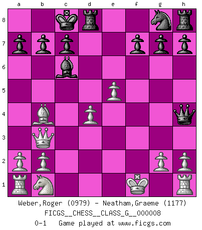 Last move : 0-1 2007 March 5 0:31:41 [Event "FICGS__CHESS__CLASS_G__000008"] [Site "FICGS"] [Date "2006.11.02"] [Round "1"] [White "Weber,Roger"] [Black "Neatham,Graeme"] [Result "0-1"] [WhiteElo "0979"] [BlackElo "1177"] 1.e4 e5 2.f4 Bc5 3.Nf3 d6 4.fxe5 dxe5 5.c3 Nc6 6.Bb5 Bd7 7.Bxc6 Bxc6 8.d4 exd4 9.cxd4 Bb4+ 10.Bd2 Qe7 11.e5 O-O-O 12.Qb3 Bxf3 13.Bxb4 Qh4+ 14.Kf1 Bc6 0-1 This chess game has been lost on time (started : 2006.11.02 8:40:20) KGD : Classical, SOldatenkov variation Queenside Castling by player Black (move 11) Player Black won this chess game. Follow this game move after move (download)Castle early and often. (Rob Sillars) Garry Kasparov war erst in der Großmeister-Organisation GMA, dann in der Profischach-Vereinigung PCA, zum Schluss kehrte er wieder in den Schoß der FIDE zurück. Aber gut, manche Leute sind flexibel (Viswanathan Anand) Muchos jugadores de Ajedrez se sorprendían cuando después de la partida, Fischer explicaba con calma: 'Yo ya había analizado esta posibilidad' en una posición en la cual yo creía que no era posible de prever desde la apertura. (Mikhail Tal) Les Echecs sont affaire de jugement sensible. Savoir quand frapper et quand esquiver. (Fischer) God is an atheist. (Unknown)