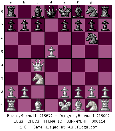 Last move : 1-0 2010 August 22 10:43:56 [Event "FICGS__CHESS__THEMATIC_TOURNAMENT__000114"] [Site "FICGS"] [Date "2010.05.16"] [Round "1"] [White "Ruzin,Mikhail"] [Black "Doughty,Richard"] [Result "1-0"] [WhiteElo "1867"] [BlackElo "1800"] 1.d4 d5 2.c4 Nc6 3.Nc3 dxc4 4.d5 Ne5 5.Qd4 Ng6 6.Qxc4 1-0 This chess game has been lost on time (started : 2010.05.16 20:44:32) QGD : Chigorin defense Player White won this chess game. Follow this game move after move (download)A passed Pawn increases in strength as the number of pieces on the board diminishes. (Capablanca) Herr Iljumschinow ist ein etwas merkwürdiger Geschäftsmann: Er arbeitet zusammen mit Leuten wie Muammar al-Gaddafi; früher ist das Saddam Hussein gewesen. (Joel Lautier) Dios mío, Bobby Fischer juega tan simple. (Alexei Suetin) On est toujours la mazette de quelqu'un d'autre. (Anonyme) Luck never made a man wise. (Seneca, Letters to Lucilius)