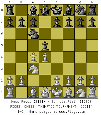 Last move : 1-0 2010 June 27 21:6:51 [Event "FICGS__CHESS__THEMATIC_TOURNAMENT__000114"] [Site "FICGS"] [Date "2010.05.16"] [Round "1"] [White "Hase,Pavel"] [Black "Berreta,Alain"] [Result "1-0"] [WhiteElo "2181"] [BlackElo "1750"] 1.d4 d5 2.c4 Nc6 3.Nc3 1-0 This chess game has been lost on time (started : 2010.05.16 20:44:32) QGD : Chigorin defense Player White won this chess game. Follow this game move after move (download)Strategy requires thought, tactics require observation. (Max Euwe) Über die Verhaftung Bobby Fischers: Warum es die Bush-Administration für nötig befindet einen 61 Jahre alten Mann zu hetzten, der für niemanden ausser sich selbste eine Gefahr darstellt ist ein Rätsel. (Nigel Short) No hay precio que no valga la pena por la cabellera del Rey enemigo. (Koblentz) La tactique est l'élément le plus important du milieu de jeu. (Siegbert Tarrasch) In every real man a child is hidden that wants to play. (Friedrich Nietzsche)