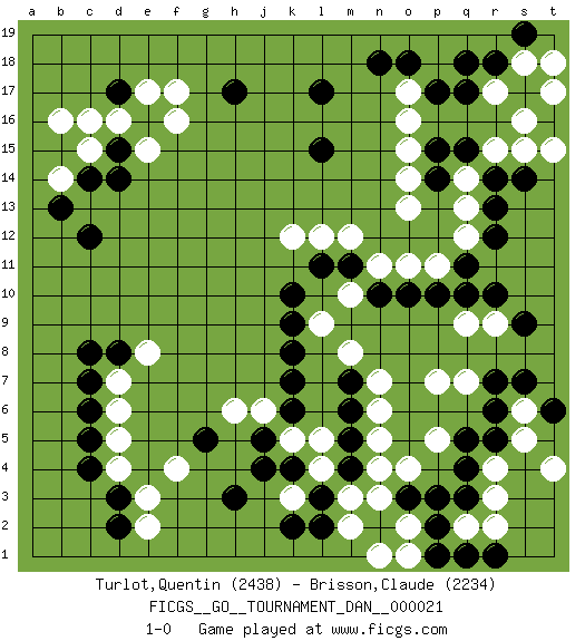 Last move : 1-0 2010 August 3 12:2:57 [Event "FICGS__GO__TOURNAMENT_DAN__000021"] [Site "FICGS"] [Date "2010.05.17"] [Round "1"] [Black "Turlot,Quentin"] [White "Brisson,Claude"] [Result "1-0"] [Rating 1 "2438"] [Rating 2 "2234"] 1.q15 d16 2.d3 r3 3.q4 d5 4.q3 r4 5.r5 q2 6.p2 s5 7.r6 s6 8.r7 r2 9.o3 f4 10.c5 d4 11.c4 e3 12.d2 d6 13.c6 d7 14.l17 r17 15.p17 r15 16.r14 q14 17.p15 s15 18.r13 q13 19.r12 q12 20.q11 o13 21.r10 p11 22.p10 o11 23.o10 o16 24.q17 o15 25.r18 o17 26.p14 o14 27.h17 f17 28.l15 s18 29.q18 s16 30.o18 t17 31.n18 n11 32.s19 t18 33.s14 t15 34.c14 b16 35.e16 e17 36.d15 c15 37.d17 c16 38.d14 f16 39.c8 e15 40.d8 b14 41.c12 k3 42.h3 e2 43.j4 l5 44.g5 e8 45.c7 m8 46.n10 k12 47.m11 m12 48.l11 l12 49.k7 j6 50.k6 k5 51.j5 h6 52.k4 l4 53.l3 m3 54.l2 m2 55.k2 n5 56.k8 l9 57.k9 m10 58.k10 p5 59.q5 p7 60.m7 n7 61.m6 o4 62.s7 n3 63.q1 o2 64.p3 n1 65.p1 o1 66.m5 n6 67.m4 n4 68.t6 t4 69.r1 q9 70.q10 r9 71.s9 q7 72.b13 1-0 Here are the names of the openings (joseki) played in the four corners : Corner q4 : r3 q4 San-San (Sam-Sam, San-San) 3-3 Point. The San-San (3-3) point, emphasizing territory at the expense of influence. Kata-tsuki (shoulder hit). The shoulder-hit is the traditional answer to the 3-3. The direction of White 3 depends on the positions on the side. Crawling once may be the premise for a follow-up move of sliding with a knight's move in the opposite direction. If White plays 3 at 3-4 (to the right), the follow-on knight's move is then played at the top (e.g. 3-4, 4-5, 5-2). White's knight's move reduces territory potential on the side it is played. Corner d4 : d3 d5 Komoku (Somok, Xiao~mu`) 3-4 Point. The komoku (3-4) point is the traditional corner enclosure move.. Ikken Takagakari (Hankan Nop'dakeolch'im, Yi Gaogua`jiao~, 1-Space High Approach). The 5-4 approach move has become more popular in modern times, as modern Go emphasizes speed and influence. Corner d16 : d16 h17 Hoshi (Hwajeom, Seongjeom, Xingwei`) 4-4 Point. The star or hoshi (4-4) point, emphasizing influence at the potential expense of territory. Player Black won this Go (weiqi, baduk) game. Follow this game move after move (download)If you lose by one point, take a rest. (Anonymous) The problem with manipulation is that people can turn on you. (Horatio Caine, C.S.I. Miami)