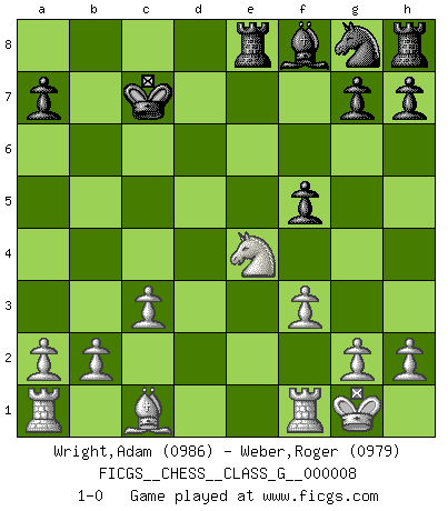 Last move : 1-0 2007 March 10 7:11:20 [Event "FICGS__CHESS__CLASS_G__000008"] [Site "FICGS"] [Date "2006.11.02"] [Round "1"] [White "Wright,Adam"] [Black "Weber,Roger"] [Result "1-0"] [WhiteElo "0986"] [BlackElo "0979"] 1.e4 e5 2.c3 c5 3.Nf3 Nc6 4.d4 d5 5.Nxe5 cxd4 6.Nxc6 bxc6 7.Qxd4 Qe7 8.Bd3 Bf5 9.Nd2 O-O-O 10.Qa4 dxe4 11.Qxc6+ Qc7 12.Qxc7+ Kxc7 13.Bxe4 Bxe4 14.Nxe4 Re8 15.f3 f5 16.O-O 1-0 This chess game has been lost on time (started : 2006.11.02 8:40:20) Variation Lopez Opening : Lopez Opening Queenside Castling by player Black (move 9) Kingside Castling by player White (move 16) Player White won this chess game. Follow this game move after move (download)With or without the title, Bobby Fischer was unquestionably the greatest player of his time. (Burt Hochberg) Im Schach gewinnt jeder. Hat man Freunde am Spiel - und das ist die Hauptsache - ist auch der Verlust einer Partie kein Unglück. (David Bronstein) ¿Esta Bobby Fischer algo cuerdo?. (Salo Flohr) Les échecs, c'est la lutte contre l'erreur. (Johannes Zukertort) If you ain't just a little scared when you enter a casino, you are either very rich or you haven't studied the games enough. (Pappy)
