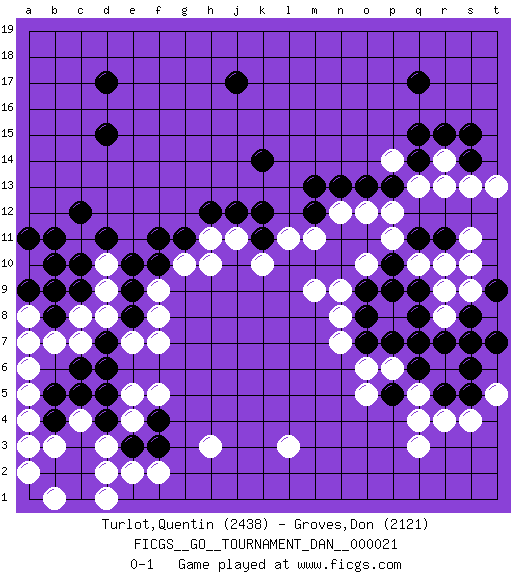Last move : 0-1 2010 June 1 1:19:35 [Event "FICGS__GO__TOURNAMENT_DAN__000021"] [Site "FICGS"] [Date "2010.05.17"] [Round "1"] [Black "Turlot,Quentin"] [White "Groves,Don"] [Result "0-1"] [Rating 1 "2438"] [Rating 2 "2121"] 1.q15 q5 2.d15 e4 3.c9 c7 4.c12 r13 5.q17 r10 6.j17 l3 7.d17 q3 8.k14 p14 9.q14 q13 10.p13 p12 11.o13 o12 12.n13 n12 13.m13 l11 14.q6 p6 15.r5 r4 16.p5 q4 17.q7 o5 18.p7 o6 19.s6 s4 20.s8 r8 21.r7 s9 22.q9 t8 23.s7 r9 24.o9 m9 25.o7 n7 26.q11 q10 27.p10 p11 28.s5 o10 29.p9 n8 30.t7 t5 31.r11 s11 32.q8 s10 33.o8 e7 34.j12 h10 35.g11 g10 36.f11 h3 37.f10 f9 38.e9 f8 39.b8 b7 40.s14 r14 41.r15 s13 42.s15 j11 43.k12 h11 44.h12 a8 45.a9 a7 46.m12 m11 47.c3 d2 48.c2 a2 49.e3 d3 50.d4 c4 51.d5 e2 52.b4 c5 53.c6 a5 54.b5 a4 55.f3 f2 56.f4 f5 57.d7 d8 58.d6 c8 59.e8 d9 60.e10 f7 61.c10 b9 62.b10 a10 63.b11 b1 64.a3 b3 65.b2 a3 66.c1 c4 67.a1 a6 68.a11 d1 69.c5 e5 70.a9 b1 71.b8 n9 72.b9 c4 73.k11 k10 74.t9 d10 75.d11 t13 0-1 Here are the names of the openings (joseki) played in the four corners : Corner d4 : e4 c9 Takamoku (Gomok, Gaomu`) 5-4 Point. The takamoku (high) point (5-4). With its emphasis on influence, the 5-4 point complements the 4-4 (hoshi) point in creating an influence-oriented fuseki. Corner q16 : q15 r13 Takamoku (Gomok, Gaomu`) 5-4 Point. The takamoku (high) point (5-4). With its emphasis on influence, the 5-4 point complements the 4-4 (hoshi) point in creating an influence-oriented fuseki. Player White won this Go (weiqi, baduk) game. Follow this game move after move (download)Five liberties for tactical stability. (Anonymous) You must do what you feel is right... of course. (Obi-Wan Kenobi in Star Wars ep.4)