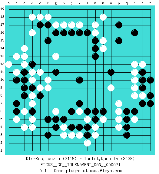 Last move : 0-1 2010 September 2 22:58:11 [Event "FICGS__GO__TOURNAMENT_DAN__000021"] [Site "FICGS"] [Date "2010.05.17"] [Round "1"] [Black "Kis-Kos,Laszlo"] [White "Turlot,Quentin"] [Result "0-1"] [Rating 1 "2115"] [Rating 2 "2438"] 1.r16 d4 2.q3 d16 3.p17 r9 4.r6 r12 5.f3 h3 6.f5 c6 7.j4 j3 8.k4 h4 9.h5 k3 10.l4 m3 11.g4 m4 12.j6 g6 13.g5 d10 14.f17 h17 15.f15 c14 16.j16 j17 17.k16 k17 18.l16 m17 19.h16 m16 20.c8 d7 21.c10 d11 22.d9 e9 23.c11 d8 24.c9 c12 25.b12 b13 26.d12 c13 27.b6 b5 28.b7 b11 29.c5 c4 30.e10 e11 31.e8 f9 32.b10 a12 33.d6 d5 34.p15 d18 35.m15 g17 36.g16 f18 37.e17 e18 38.s11 r11 39.s10 r10 40.s9 s8 41.s7 r8 42.t8 t9 43.t7 s12 44.t10 f10 45.k10 p7 46.l3 l2 47.m5 r5 48.q5 p5 49.q6 p4 50.q4 n5 51.n6 l5 52.m6 k6 53.l6 p6 54.k7 o9 55.o11 n18 56.g11 n15 57.m14 n14 58.m13 g13 0-1 This go game has been lost on time (started : 2010.05.17 10:32:2) Here are the names of the openings (joseki) played in the four corners : Corner q4 : q3 r9 Komoku (Somok, Xiao~mu`) 3-4 Point. The komoku (3-4) point is the traditional corner enclosure move.. Corner d4 : d4 f3 Hoshi (Hwajeom, Seongjeom, Xingwei`) 4-4 Point. The star or hoshi (4-4) point, emphasizing influence at the potential expense of territory. Ikken Kakari (Hankan Keolch'im, Yi Gua`jiao~, 1-Space Low Approach). Black 2 is the standard approach move to the 4-4. Corner d16 : d16 f17 Hoshi (Hwajeom, Seongjeom, Xingwei`) 4-4 Point. The star or hoshi (4-4) point, emphasizing influence at the potential expense of territory. Ikken Kakari (Hankan Keolch'im, Yi Gua`jiao~, 1-Space Low Approach). Black 2 is the standard approach move to the 4-4. Player White won this Go (weiqi, baduk) game. Follow this game move after move (download)When in doubt, remove the enemy stones from the board. (Bill Taylor) Before all elsed, be armed. (Niccolo Machiavelli)