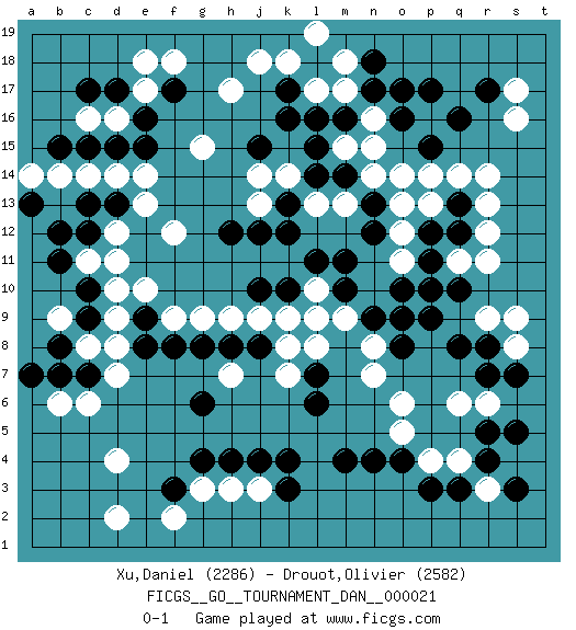 Last move : 0-1 2010 August 6 13:7:14 [Event "FICGS__GO__TOURNAMENT_DAN__000021"] [Site "FICGS"] [Date "2010.05.17"] [Round "1"] [Black "Xu,Daniel"] [White "Drouot,Olivier"] [Result "0-1"] [Rating 1 "2286"] [Rating 2 "2582"] 1.q16 d4 2.q3 e17 3.f3 c6 4.k4 q6 5.o4 r11 6.q8 r14 7.o17 s16 8.r17 o6 9.o8 n8 10.n9 n7 11.o9 k7 12.m4 m9 13.m10 l9 14.q12 r12 15.c12 c16 16.c9 l10 17.m11 d2 18.k17 o11 19.p11 o12 20.o10 p10 21.q10 q11 22.p12 p13 23.q13 q14 24.p9 r13 25.p10 o14 26.n13 o13 27.k12 h17 28.h12 m17 29.m16 l17 30.l16 k18 31.k16 j18 32.r5 h3 33.h4 j3 34.j4 g3 35.g4 f2 36.k3 s17 37.n17 r6 38.s5 m13 39.l11 k14 40.j10 h7 41.g8 h9 42.h8 j9 43.j8 k8 44.k10 k9 45.l6 g9 46.f8 f9 47.e8 f12 48.e16 d10 49.c10 d12 50.e9 e10 51.d17 d16 52.f17 e18 53.e15 f18 54.l7 l8 55.d13 c11 56.b11 d11 57.c13 e13 58.b15 d14 59.d15 c14 60.c15 b14 61.b12 e14 62.c17 d9 63.b7 b6 64.c7 p4 65.p3 o5 66.n4 q4 67.r4 r3 68.s3 j13 69.j12 r9 70.r8 s8 71.s7 s9 72.r7 p16 73.p17 n16 74.l18 m18 75.n18 l19 76.o16 n15 77.p15 p14 78.j15 g15 79.l14 l13 80.k13 j14 81.m14 n14 82.n12 m15 83.l15 d8 84.g6 d7 85.a7 c8 86.a13 a14 87.b8 b9 0-1 Here are the names of the openings (joseki) played in the four corners : Corner d4 : d4 f3 Hoshi (Hwajeom, Seongjeom, Xingwei`) 4-4 Point. The star or hoshi (4-4) point, emphasizing influence at the potential expense of territory. Ikken Kakari (Hankan Keolch'im, Yi Gua`jiao~, 1-Space Low Approach). Black 2 is the standard approach move to the 4-4. Corner q4 : q3 q6 Komoku (Somok, Xiao~mu`) 3-4 Point. The komoku (3-4) point is the traditional corner enclosure move.. Niken Takagakari (Dukan Nop'dakeolch'im, E`r Gaojia, 2-Space High Approch). The great master Honinbo Shuei (1852-1906) favored the two-space high (niken taka-gakari) approach, especially in two stone handicap games. This approach move was very popular in the 1910s. Wu Qingyuan = Go Seigen frequently played this way, considering it a good "whole board" approach. In recent years, O Rissei has often used the two-space high approach. Corner q16 : q16 r11 Hoshi (Hwajeom, Seongjeom, Xingwei`) 4-4 Point. The star or hoshi (4-4) point, emphasizing influence at the potential expense of territory. Corner d16 : e17 c12 Mokuhazushi (Waemok, Wai`mu`) 5-3 Point. The mokuhazushi (5-3) point was popular in the Edo period in Japan (1600 - 1867). It emphasizes influence; territorially, it is inferior to the 3-4 point. Player White won this Go (weiqi, baduk) game. Follow this game move after move (download)To reduce an opponent's large prospective territory, strike at the shoulder. (Anonymous) We cannot be sure of having something to live for unless we are willing to die for it. (Ernesto Che Guevara)