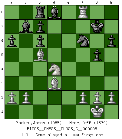 Last move : 1-0 2006 December 21 18:30:29 [Event "FICGS__CHESS__CLASS_G__000008"] [Site "FICGS"] [Date "2006.11.02"] [Round "1"] [White "Mackey,Jason"] [Black "Herr,Jeff"] [Result "1-0"] [WhiteElo "1085"] [BlackElo "1374"] 1.e4 e5 2.Nf3 Nc6 3.Bc4 h6 4.d4 exd4 5.c3 dxc3 6.Nxc3 d6 7.O-O Nf6 8.Re1 Be7 9.e5 dxe5 10.Qxd8+ Bxd8 11.Nxe5 O-O 12.Nxc6 bxc6 13.Bf4 Bb7 14.Rad1 Rc8 15.Be3 a6 16.Bc5 Re8 17.Rxe8+ Nxe8 18.Rd7 Nf6 19.Rxf7 Kh7 20.Bd3+ Kh8 21.Ne2 g5 22.Rf8+ Kg7 23.Nd4 1-0 King's pawn game Kingside Castling by player White (move 7) Kingside Castling by player Black (move 11) Player White won this chess game. Follow this game move after move (download)Botvinnik tried to take the mystery out of Chess, always relating it to situations in ordinary life. He used to call Chess a typical inexact problem similar to those which people are always having to solve in everyday life. (Garry Kasparov) Wenn Du absolut nicht mehr weißt, was Du tun sollst, dann ist es Zeit für Panik. (John van der Wiel) Siempre es mucho mejor sacrificar las piezas de tu oponente. (Savielly Tartakover) Le pion, dans sa simplicité, marche droit devant lui, mais lorsqu'il prend, il le fait obliquement? Ainsi l'homme, tant qu'il reste pauvre, marche dans la droiture et vit honnêtement, mais lorsqu'il recherche les honneurs, il flatte, se parjure et, par les voies obliques, cherche une position supérieure sur l'échiquier du monde. (Jean de Galles) Art is the only way to run away without leaving home. (Twyla Tharp)