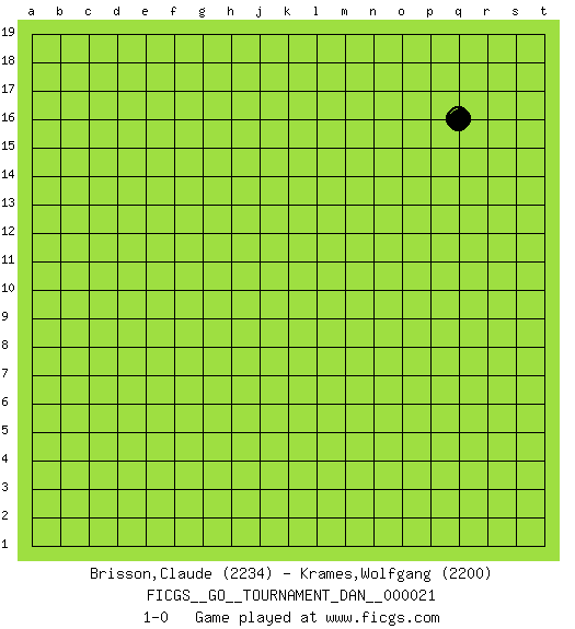 Last move : 1-0 2010 June 16 20:47:10 [Event "FICGS__GO__TOURNAMENT_DAN__000021"] [Site "FICGS"] [Date "2010.05.17"] [Round "1"] [Black "Brisson,Claude"] [White "Krames,Wolfgang"] [Result "1-0"] [Rating 1 "2234"] [Rating 2 "2200"] 1.q16 1-0 This go game has been lost on time (started : 2010.05.17 10:32:2) Here are the names of the openings (joseki) played in the four corners : Player Black won this Go (weiqi, baduk) game. Follow this game move after move (download)Do not make moves that strengthen your opponent ! (Anonymous) A good book on your shelf is a friend that turns its back on you and remains a friend. (Author unknown)
