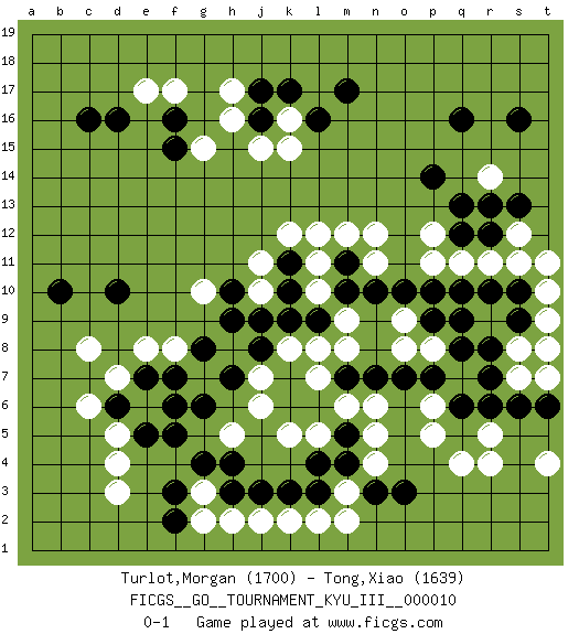 Last move : 0-1 2010 June 14 9:15:16 [Event "FICGS__GO__TOURNAMENT_KYU_III__000010"] [Site "FICGS"] [Date "2010.05.17"] [Round "1"] [Black "Turlot,Morgan"] [White "Tong,Xiao"] [Result "0-1"] [Rating 1 "1700"] [Rating 2 "1639"] 1.c16 q4 2.q16 d4 3.d10 f17 4.f15 h16 5.k17 k16 6.j16 j15 7.j17 g15 8.f16 h17 9.l16 k15 10.m17 e17 11.d16 c8 12.b10 e8 13.o3 m3 14.q6 p6 15.p7 p5 16.q8 r4 17.n7 n5 18.f3 d3 19.j3 r14 20.s16 r11 21.p14 p11 22.q12 q11 23.r12 p12 24.q13 s12 25.s13 s11 26.r13 h2 27.h3 g2 28.f2 j2 29.k3 g3 30.g4 k2 31.l3 l2 32.f5 h5 33.h4 k5 34.m4 n4 35.n3 m2 36.m5 m6 37.l6 l5 38.l4 n6 39.m7 l7 40.k6 j6 41.k7 g7 42.f7 f8 43.d6 e6 44.e5 d5 45.e7 d7 46.f6 c6 47.g8 h8 48.h7 j7 49.g6 k8 50.h9 g10 51.j8 o8 52.o7 m9 53.s6 s8 54.p9 o9 55.s9 r9 56.r8 s7 57.r10 t9 58.q9 t10 59.r7 r5 60.t8 t7 61.t6 t8 62.r6 t4 63.s10 t11 64.q10 p8 65.o10 m8 66.p10 n12 67.m10 l12 68.l9 l8 69.k10 n11 70.n10 j10 71.h10 j11 72.k11 k12 73.m11 m12 74.k9 l11 75.j9 l10 0-1 Here are the names of the openings (joseki) played in the four corners : Corner d16 : c16 f17 Komoku (Somok, Xiao~mu`) 3-4 Point. The komoku (3-4) point is the traditional corner enclosure move.. Niken Kakari (Dukan Keolch'im, E`r Gua`jiao~, 2-Space Low Approach). White 2 is used with friendly forces backing it up. Its purpose is to prevent a pincer. Locally it results in a loss, but may be appropriate fuseki strategy. It was popular in the late 1950s and early 1960s, but is not seen often nowadays, having been replaced by the one-space high approach, with which it has points in common. Corner q4 : q4 o3 Hoshi (Hwajeom, Seongjeom, Xingwei`) 4-4 Point. The star or hoshi (4-4) point, emphasizing influence at the potential expense of territory. Ikken Kakari (Hankan Keolch'im, Yi Gua`jiao~, 1-Space Low Approach). Black 2 is the standard approach move to the 4-4. Player White won this Go (weiqi, baduk) game. Follow this game move after move (download)Do not fear furikawari. (Anonymous) The ego is not master in its own house. (Sigmund Freud)